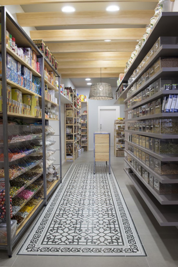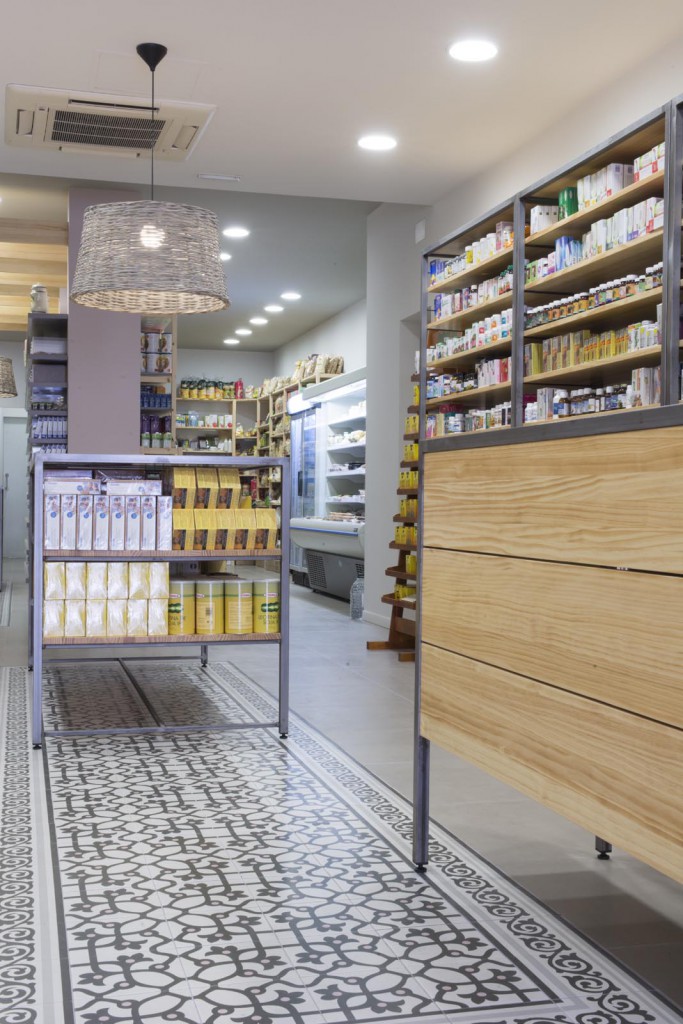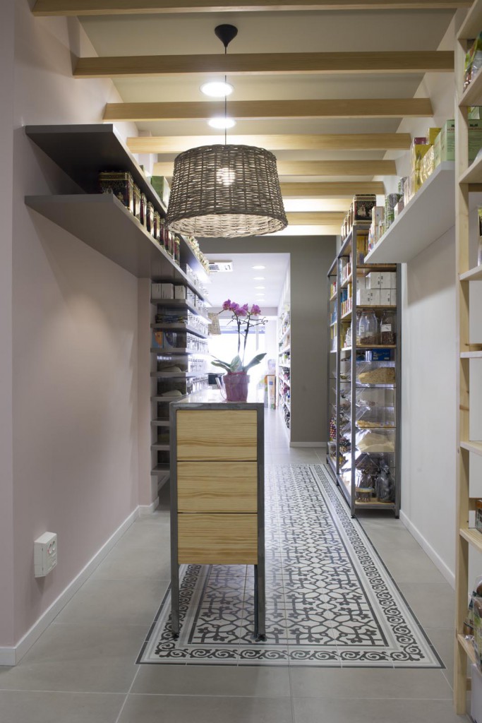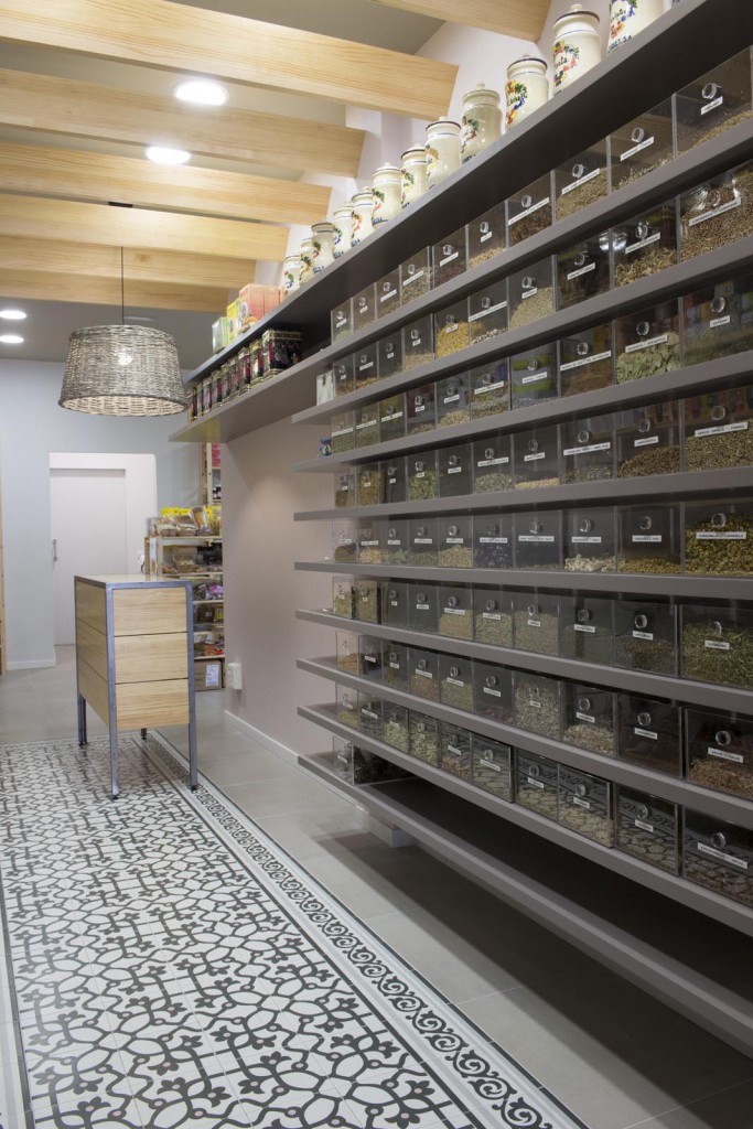 Per un altre tipus de producte s’ha dissenyat una prestatgeria a base de pladur pintat, col·locada en el costat oposat a les prestatgeries de ferro. I pel tercer grup de productes, les prestatgeries s’han col·locat de fusta. Finalment s’ha singularitzat el racó de les herbes, amb prestatges de fusta lacada de color i urnes de metacrilat.