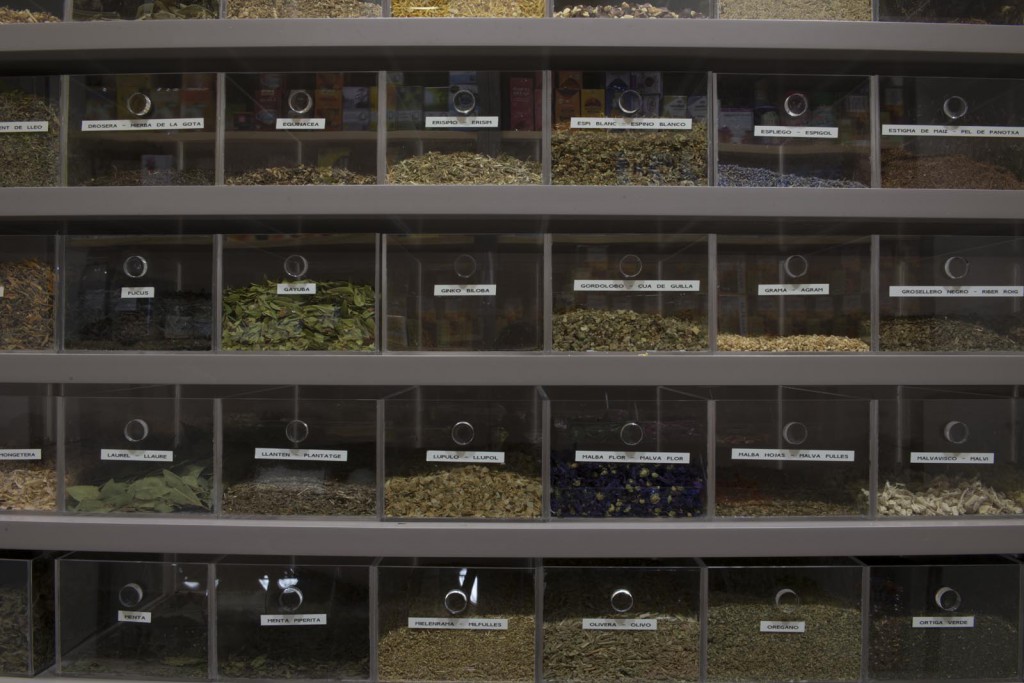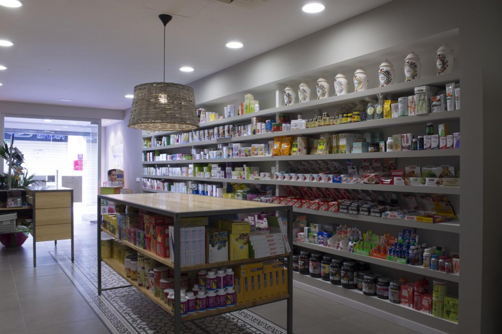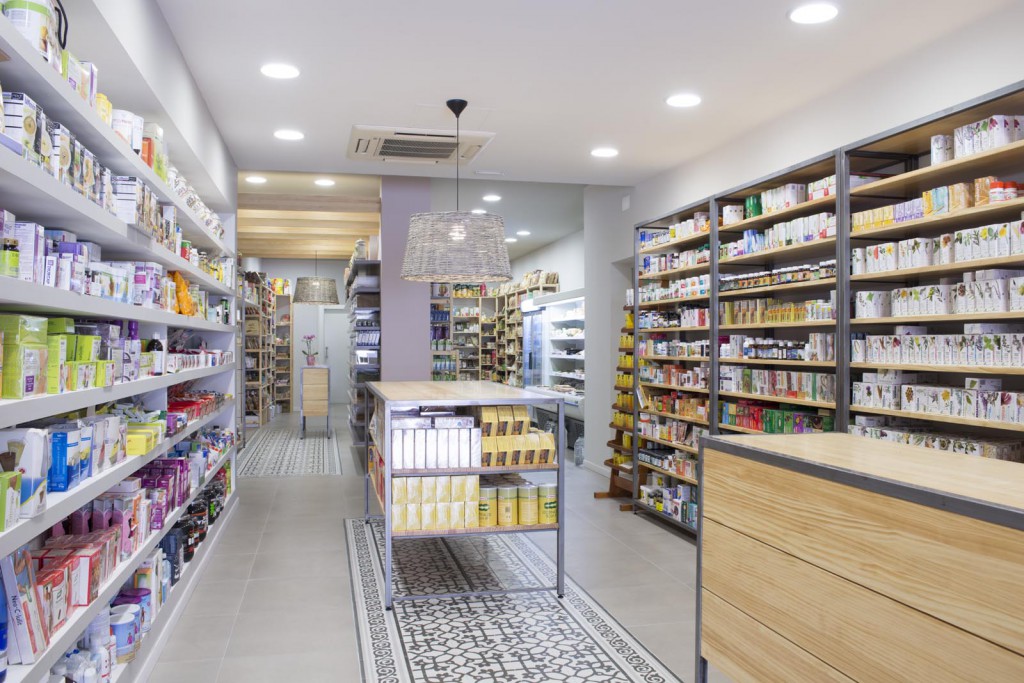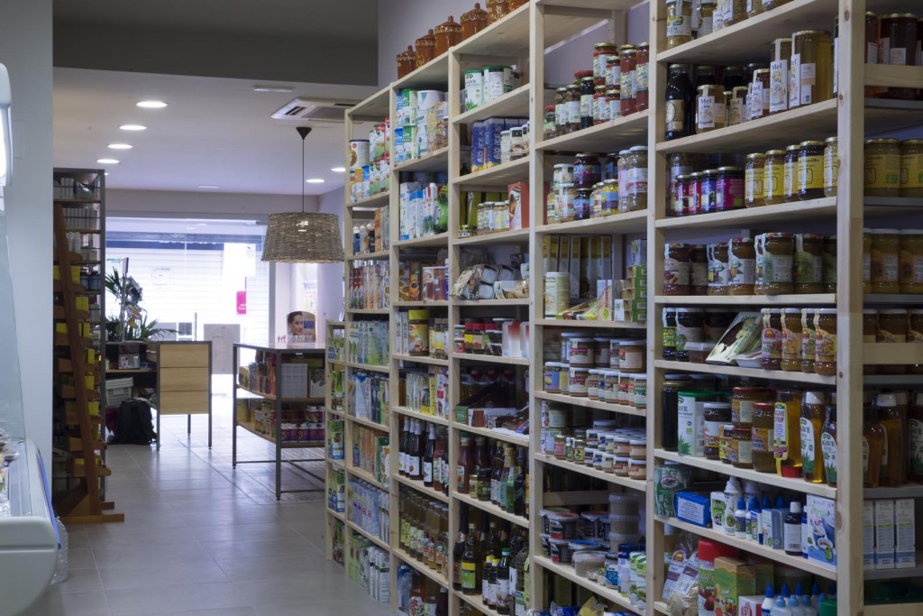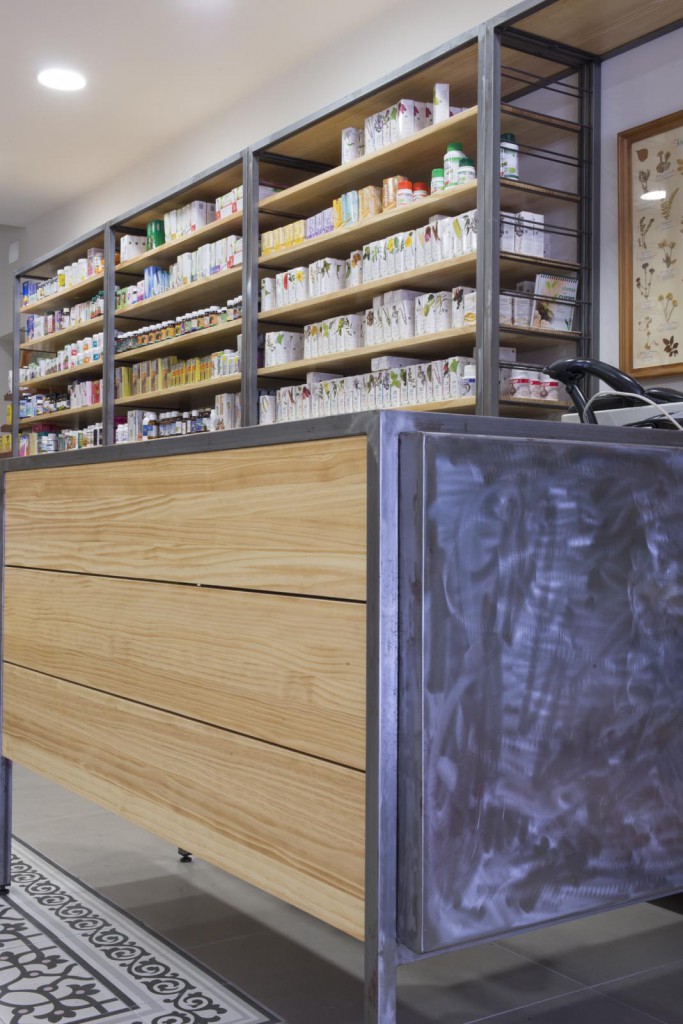 Per un altre tipus de producte s’ha dissenyat una prestatgeria a base de pladur pintat, col·locada en el costat oposat a les prestatgeries de ferro. I pel tercer grup de productes, les prestatgeries s’han col·locat de fusta. Finalment s’ha singularitzat el racó de les herbes, amb prestatges de fusta lacada de color i urnes de metacrilat.