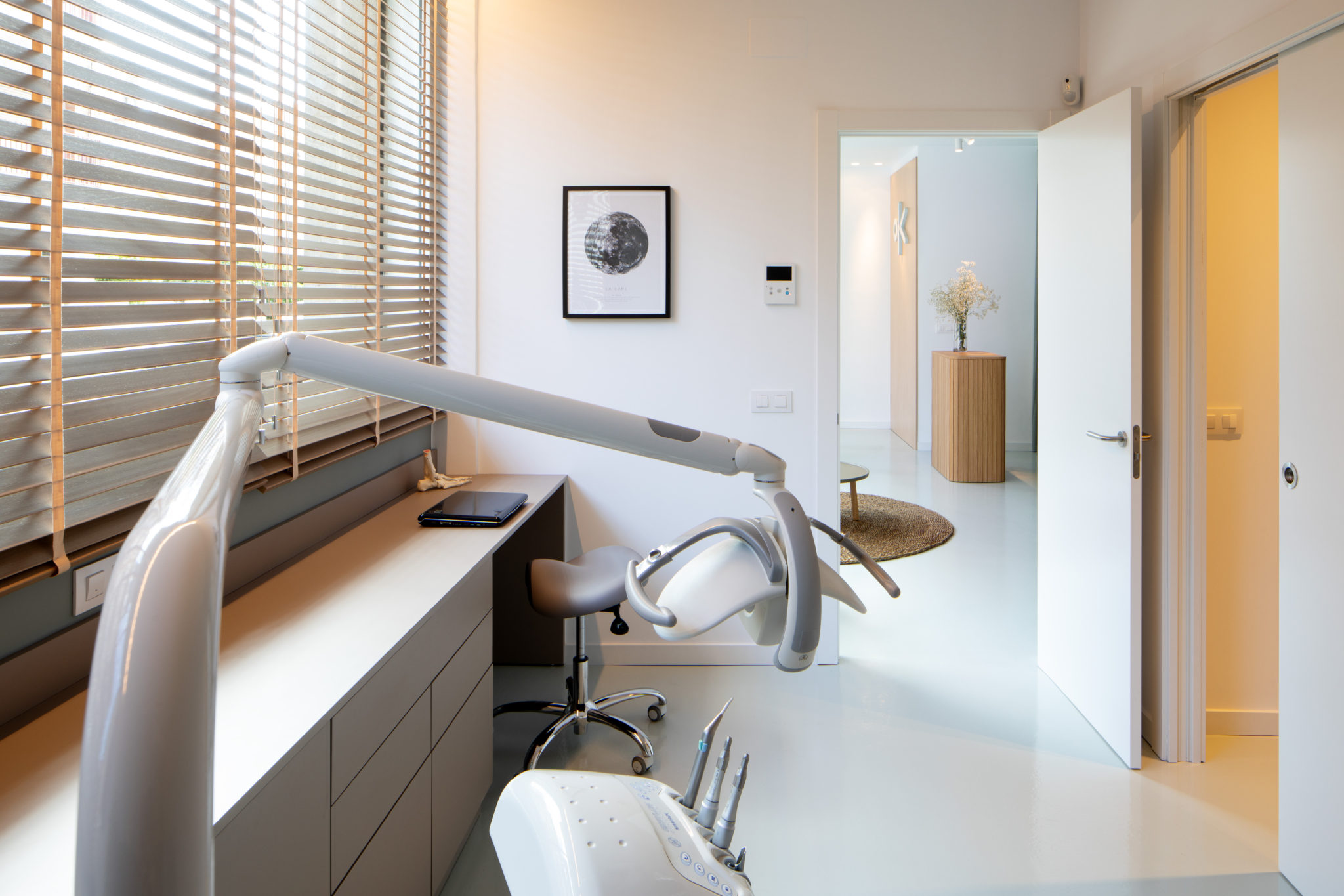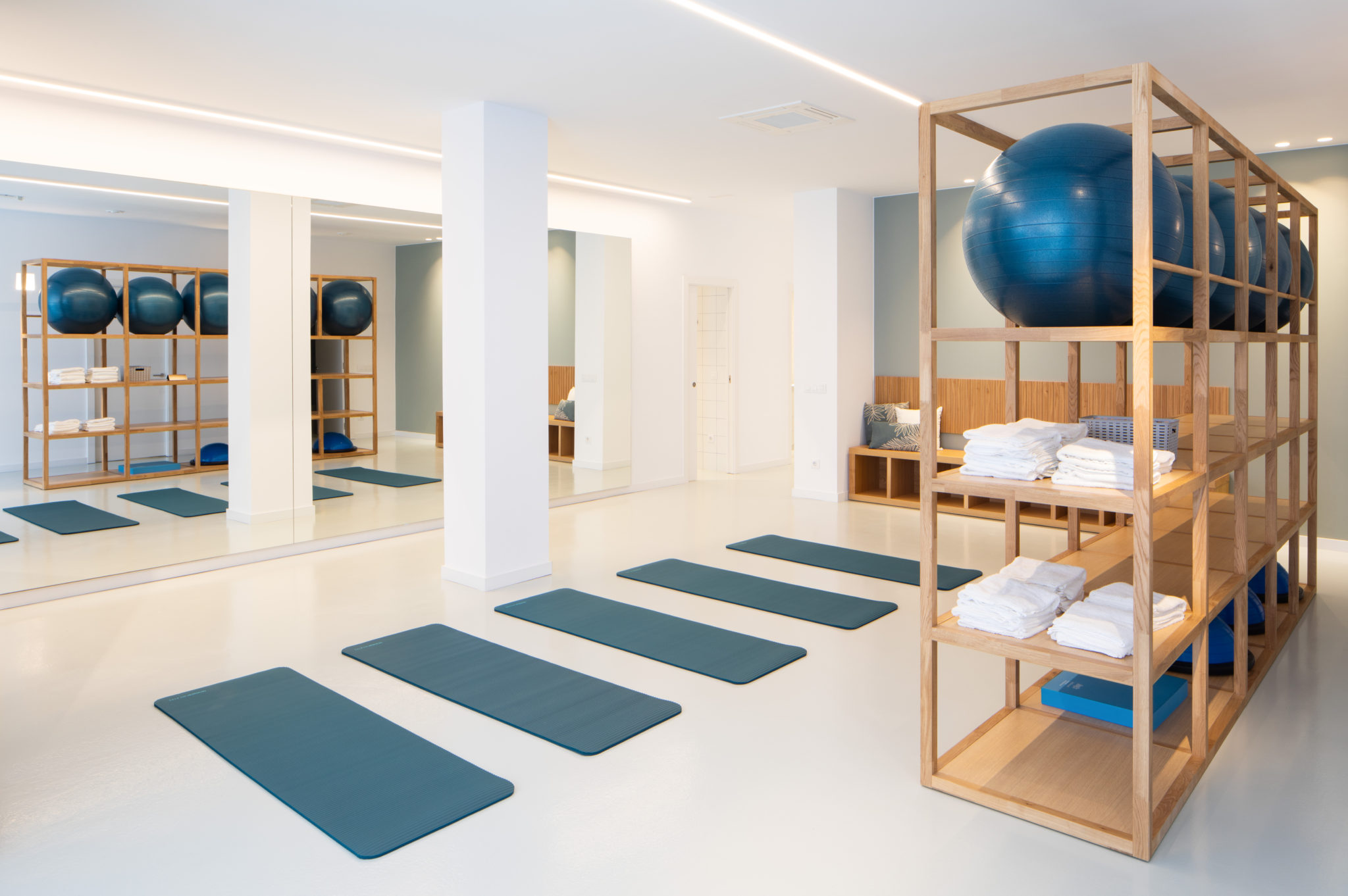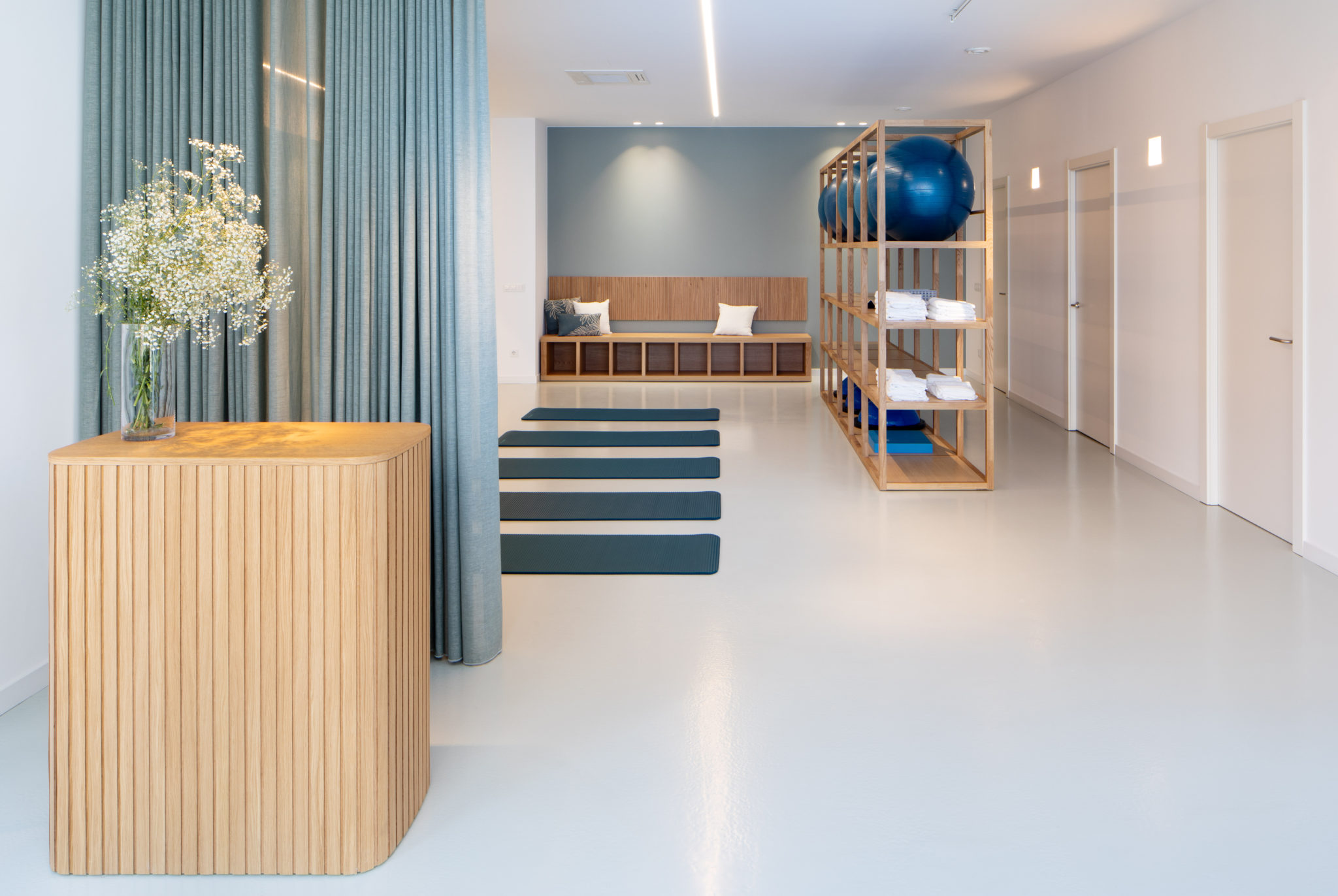 Reforma d’un local existent per destinar-lo a centre de fisioteràpia i podologia a Vilafranca. El projecte s’ha resolt amb una paleta cromàtica amb tons aquosos, fusta natural i blanc, distints tipus d’il·luminació i una part central d’ús flexible, delimitada amb una gran cortina que serveix al mateix temps com a teló de fons del punt de recepció.