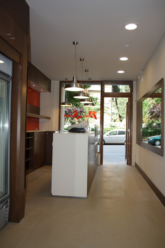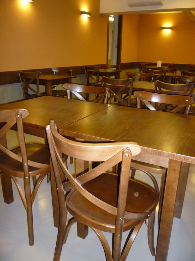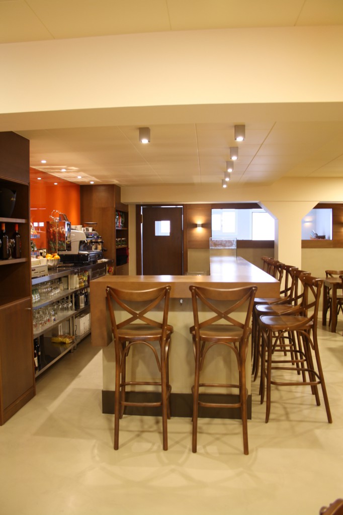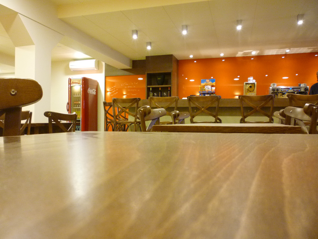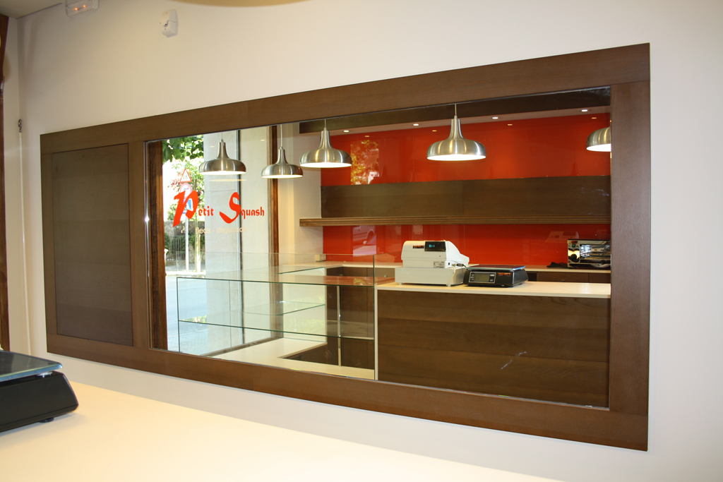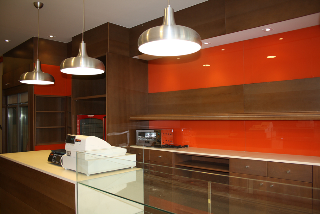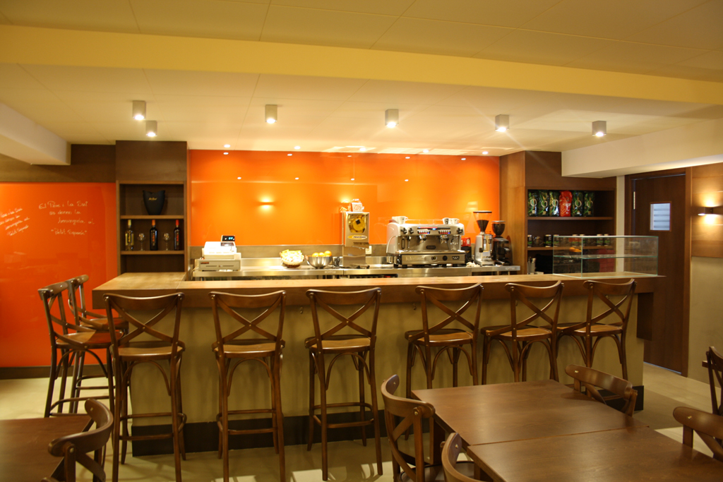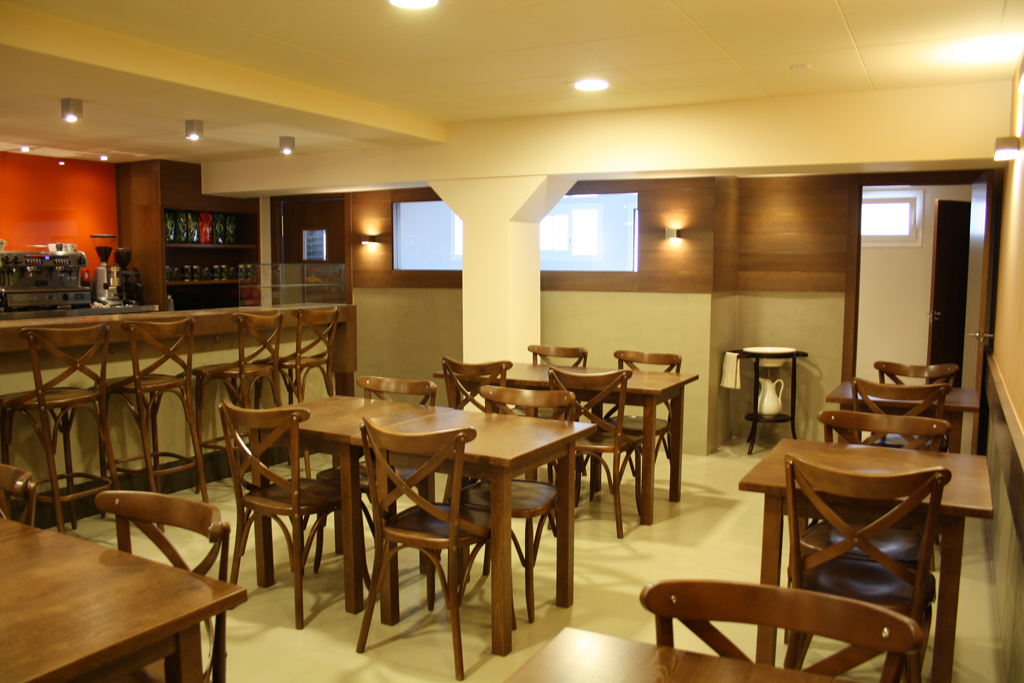 En tot el local s’ha utilitzat fusta tenyida de color noguera. A la zona de venda, el taulell dissenyat a mida ha combinat la fusta, la superfície de treball de silestone i una gran vitrina expositora en forma de L de vidre transparent. Les parets de darrera les barres s’han revestit amb vidre laminat de color taronja per aplicar un toc de color que demanava el client i permetre la retolació, amb color blanc o similar, de tota la carta de productes disponible. El mobiliari escollit, recordant el típic de cafè, va en consonància amb el to de la fusta escollit per l’actuació. Parets i sostres s’han pintat de color clar, amb un to ataronjat en la paret que disposa d’arrambador.