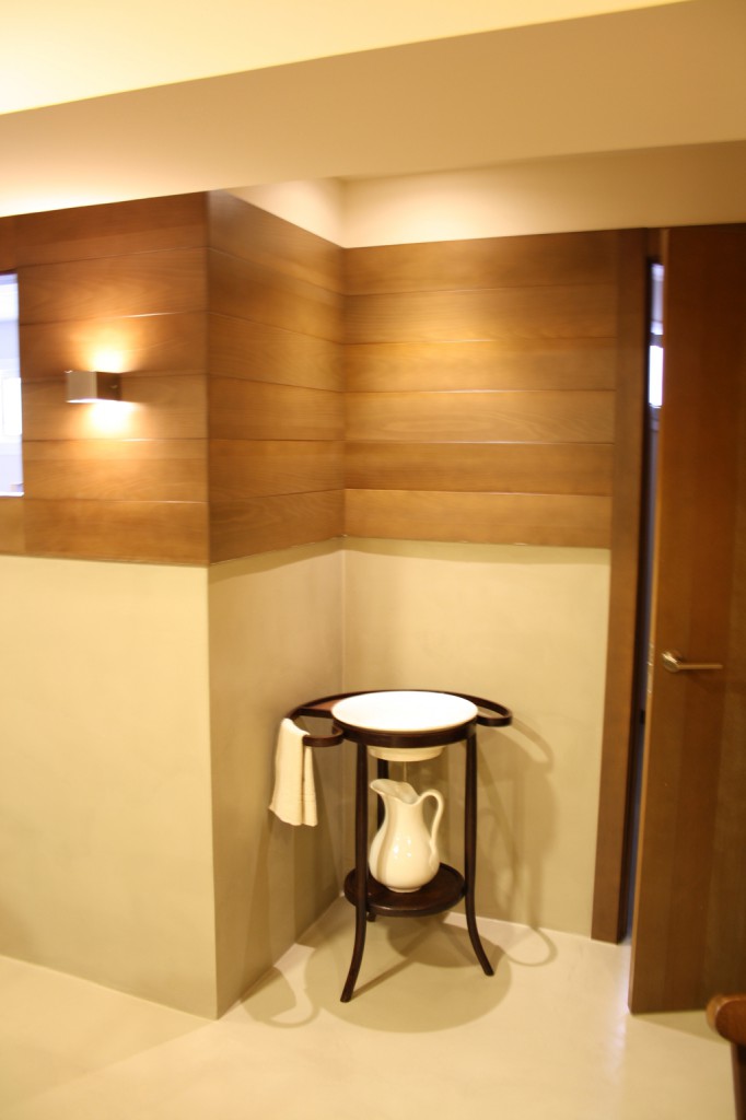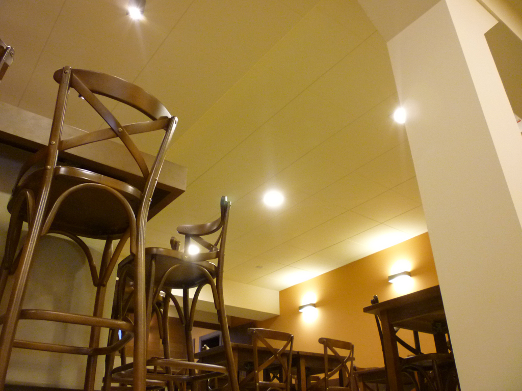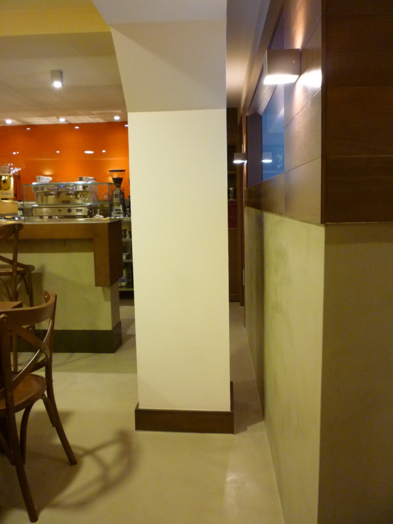 El paviment de la part de baix i les escales es va fer amb gres porcel·lànic mentre que a la part de dalt es va optar per l’aplicació de microciment, amb uns resultats molt satisfactoris. També es va utilitzar el microciment per fer un arrambador a la paret de la zona de taules, rematat amb una peça de fusta, i a la part baixa de la barra on s’hi va posar un sòcol de ferro pintat.