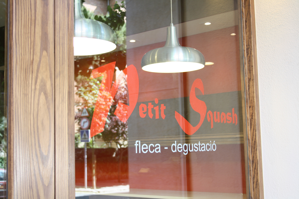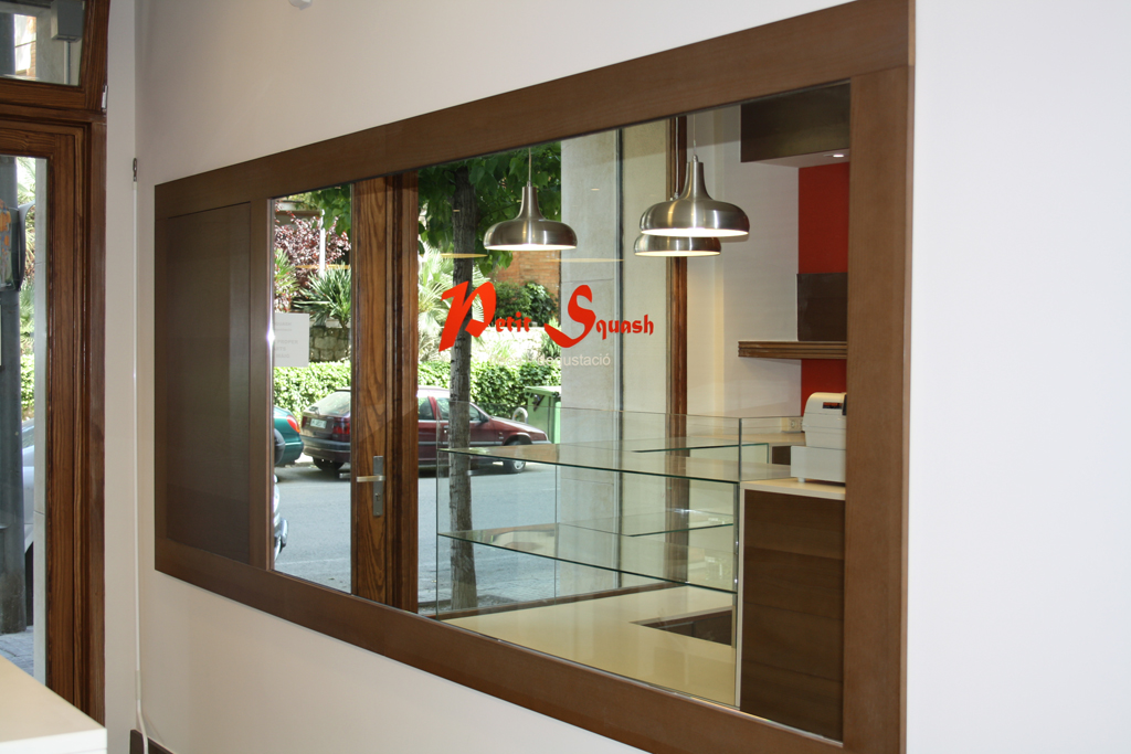 El tancament exterior, fet a base de fusta de melis vernissat mate, vol transmetre la idea de quin tipus de local ens trobarem a l’interior, càlid i acollidor. La mínima retolació, a base de vinil enganxat als vidres, pretén crear una màxima transparència entre interior i exterior.