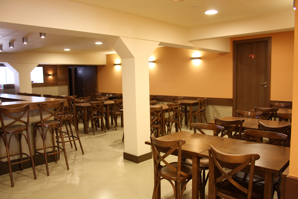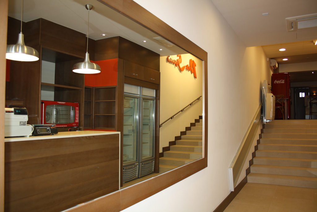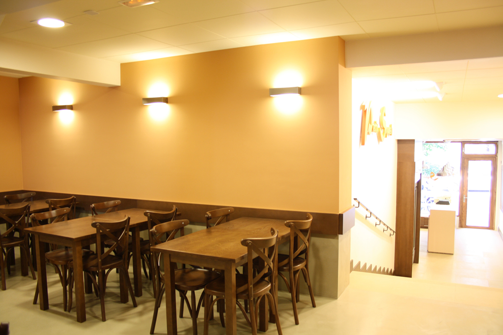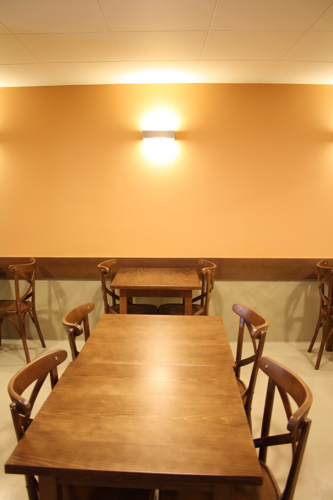 A la zona inferior, que dóna directament al carrer, s’hi va ubicar la zona de venda de pa i al nivell superior s’hi va crear l’espai destinat a cafeteria, amb zona de barra i zona de taules, a més d’ubicar-hi els serveis i les dependències d’ús intern.