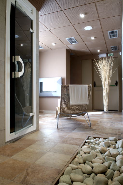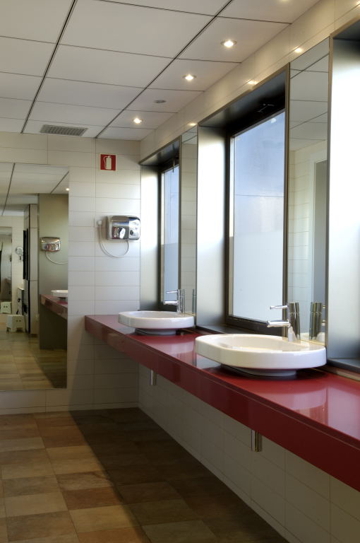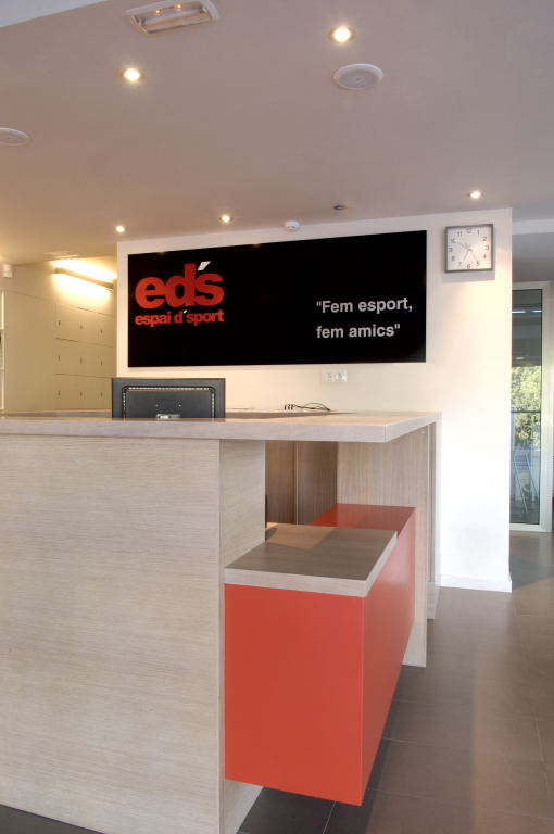 En la majoria de revestiments de paret i als sostres, per compensar en general la manca d’alçada, es van utilitzar tons clars, ja sigui amb DM lacat, pintura o rajoles, amb notes de color puntuals en distints espais com la zona d’aigua, cabines o a la zona d’entrada, utilitzant un vermell intens que forma part de la imatge gràfica del gimnàs.