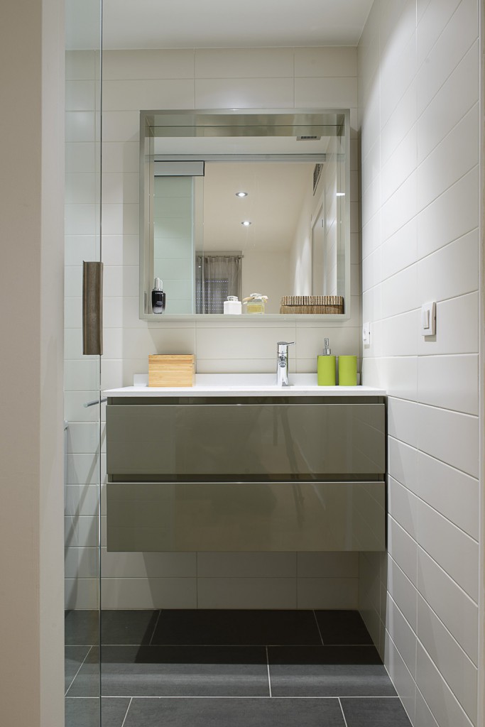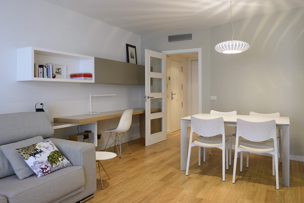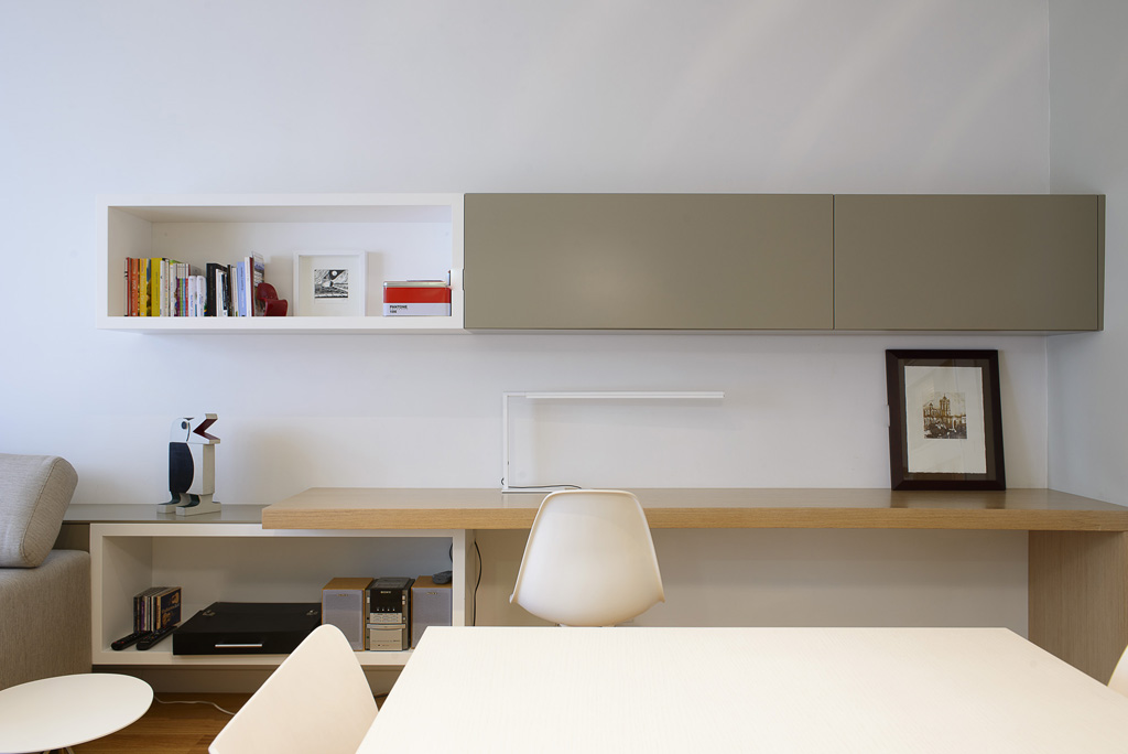 Es va lacar tota la fusteria existent de color blanc, substituint manetes i vidres. Es va emparquetar el terra amb parquet de roure. Es va dissenyar tota una sèrie de mobiliari a mida, combinant lacats blancs i de color i fusta de roure, i es va complementar amb mobiliari i lluminàries de compra.