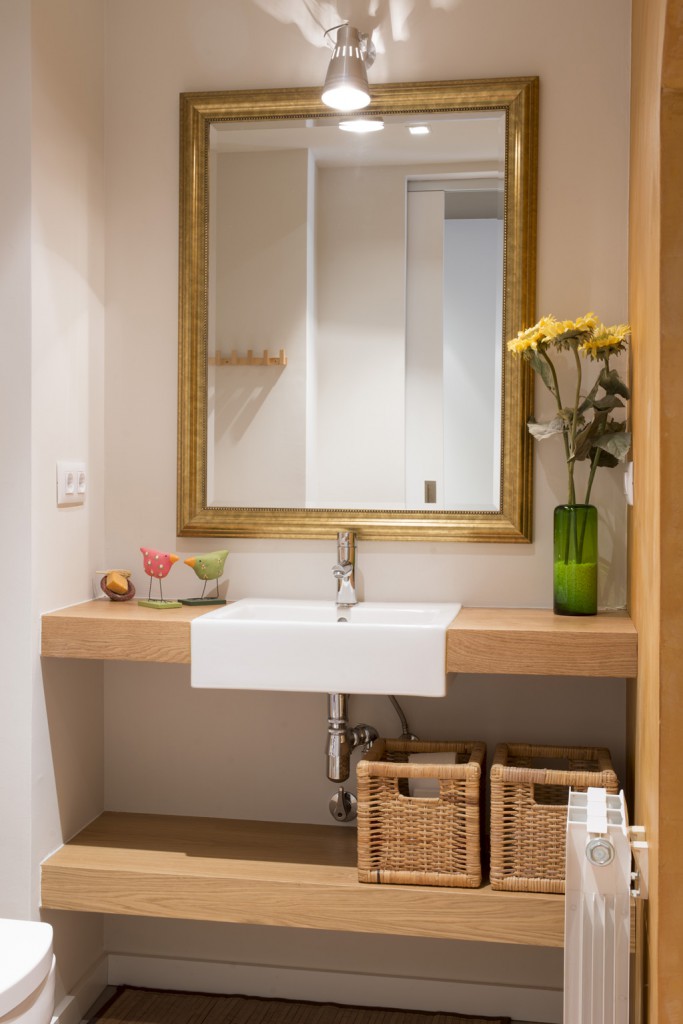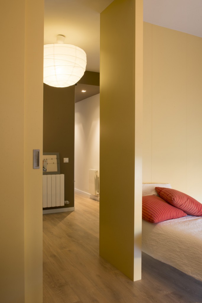 Parquet com a terra general, amb gres a banys i cuina, fusteria i mobiliari fet a mida de DM lacat blanc, i parets de color clar amb aplicacions puntuals de color.