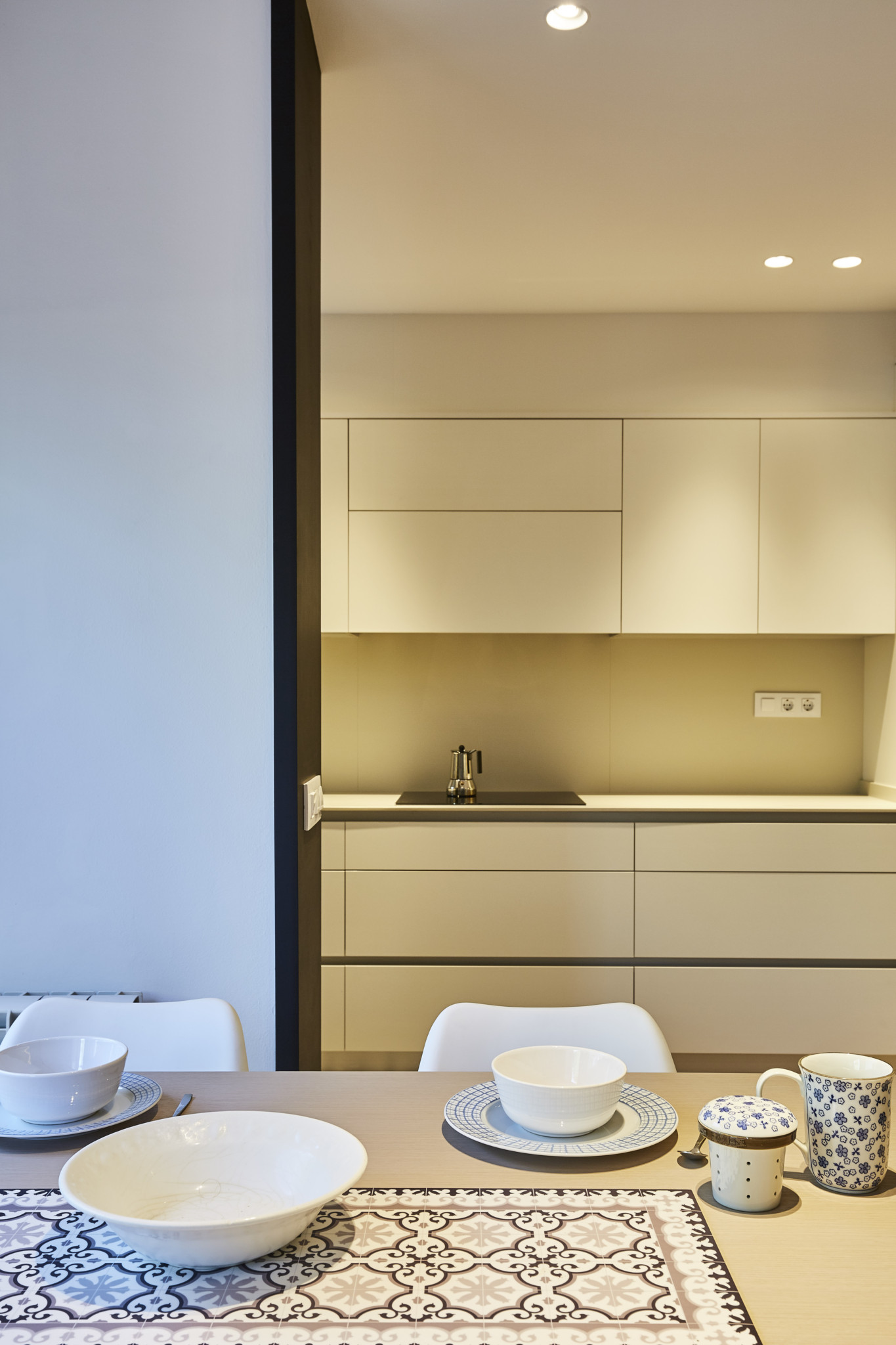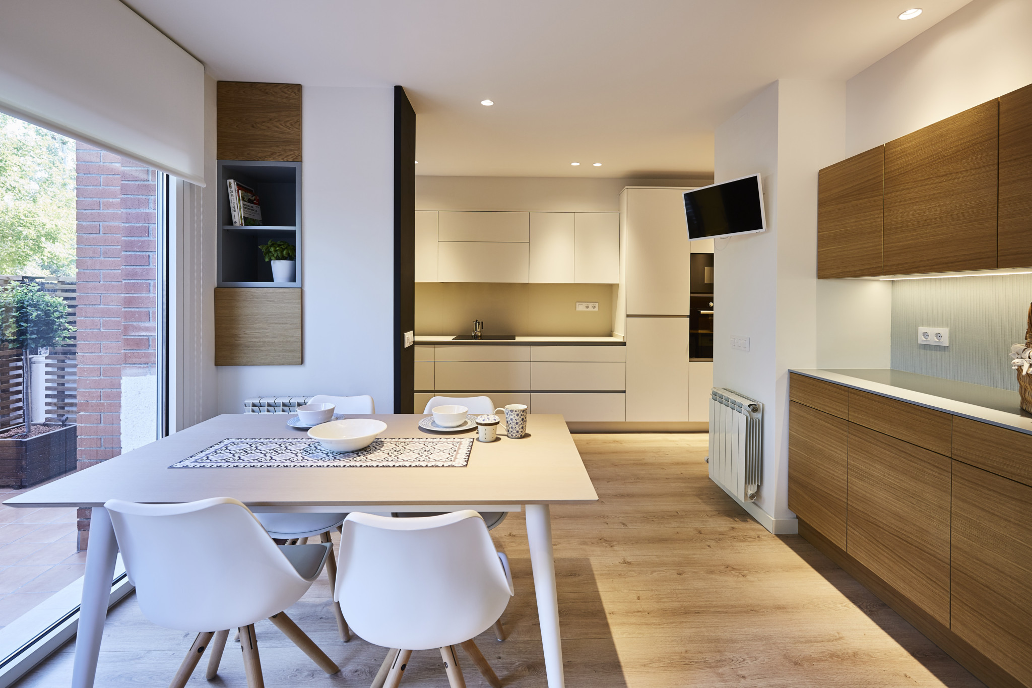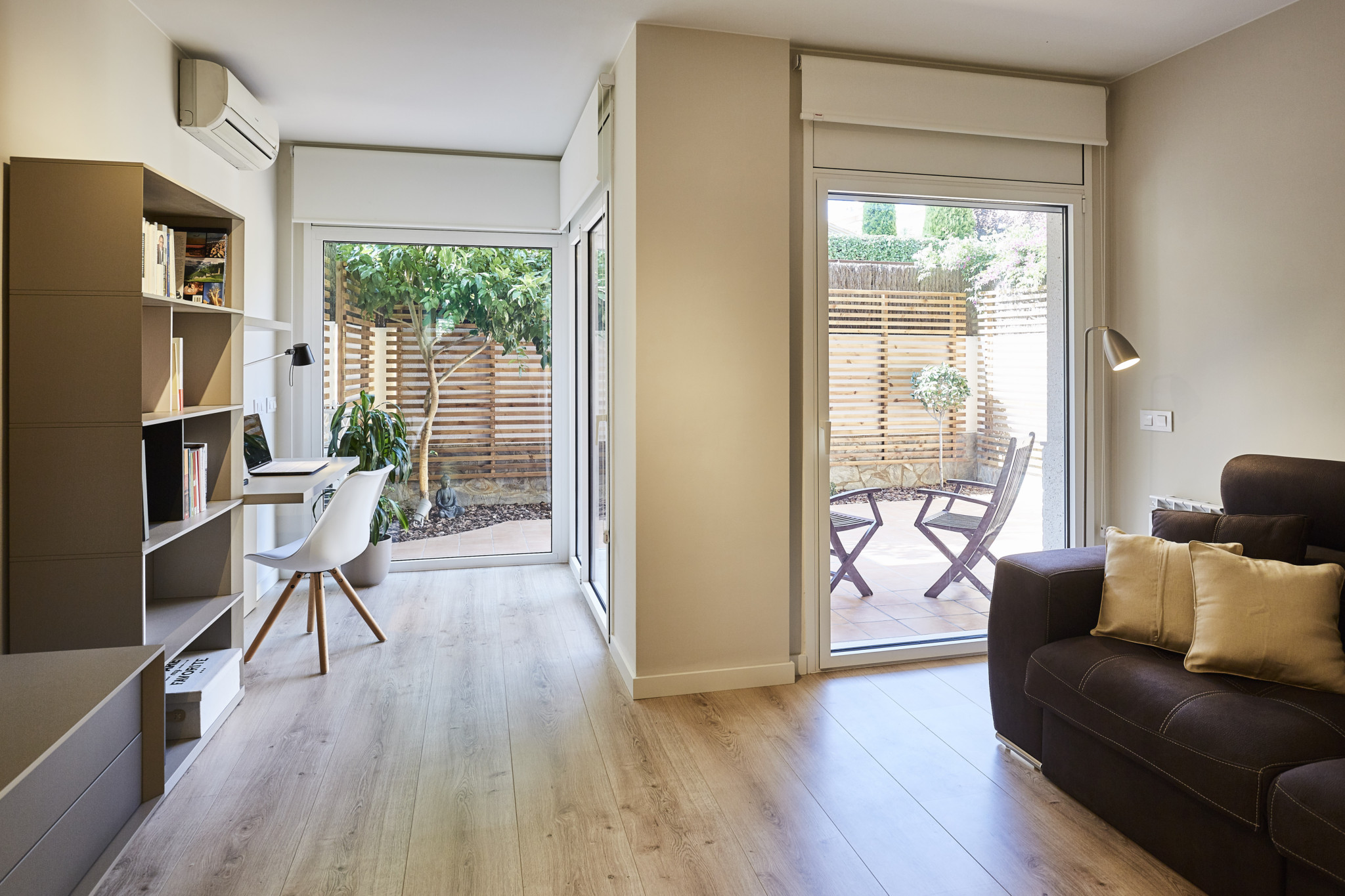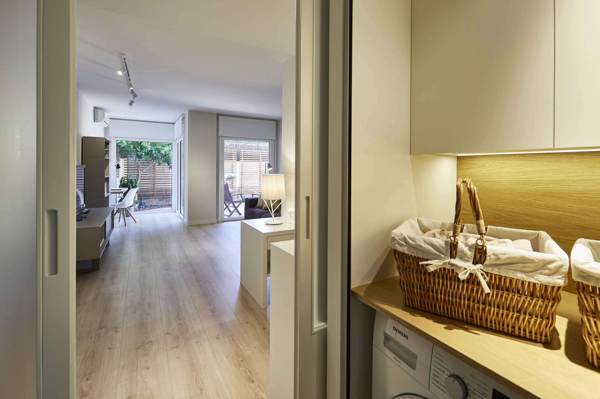 Reforma integral d’un habitatge en planta baixa. La intervenció planteja uns espais més oberts que els que tenia l’habitatge original i millorar la relació visual entre les estances d’una i altra banda del pis. També s’ha volgut aconseguir la integració visual de les terrasses situades a un i altre extrem de la vivenda amb les zones interiors, per poder-ne gaudir de forma continuada i sense la necessitat d’estar físicament a l’exterior. Els canvis en la distribució i la utilització de materials completament diferents als que tenia el pis original permet tenir la sensació d’estar en un habitatge completament nou.