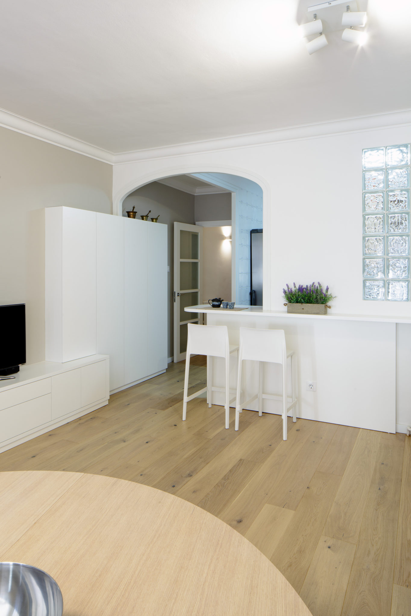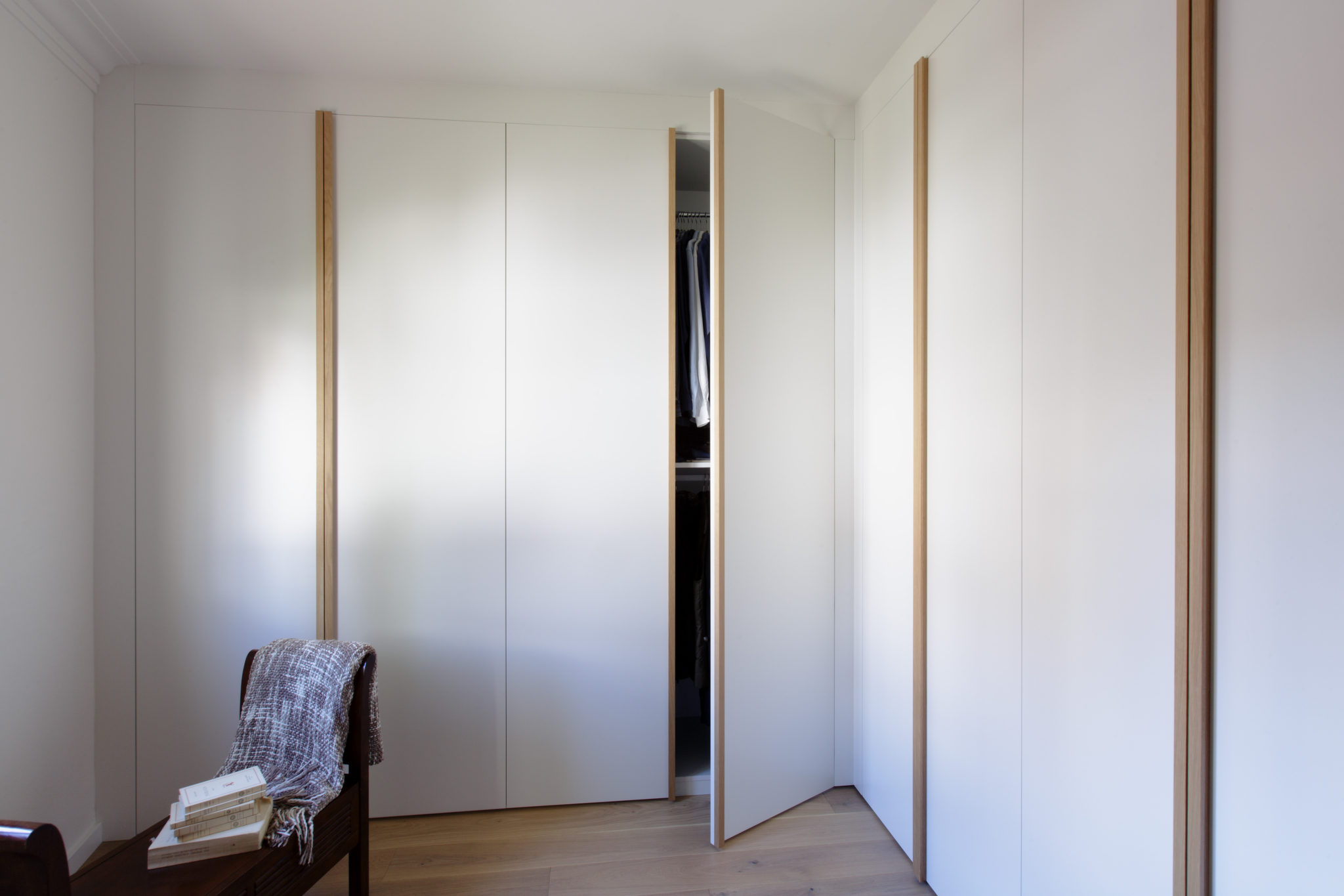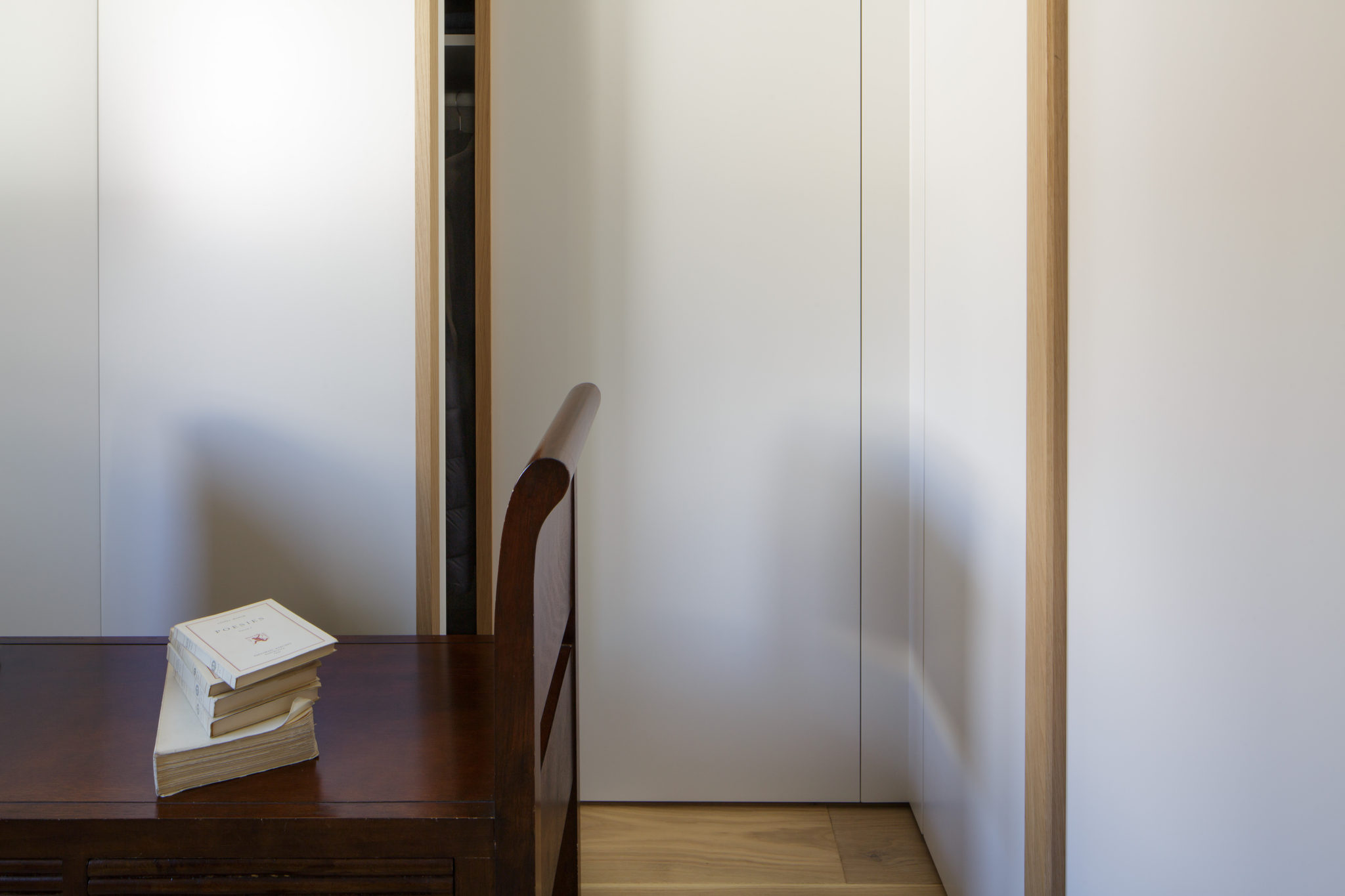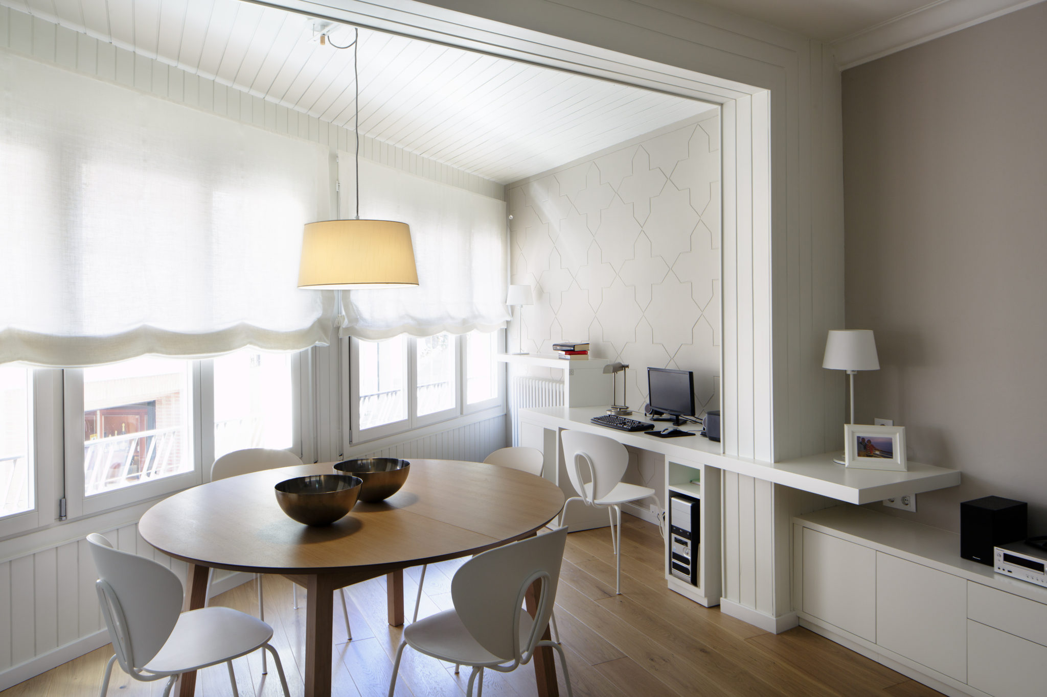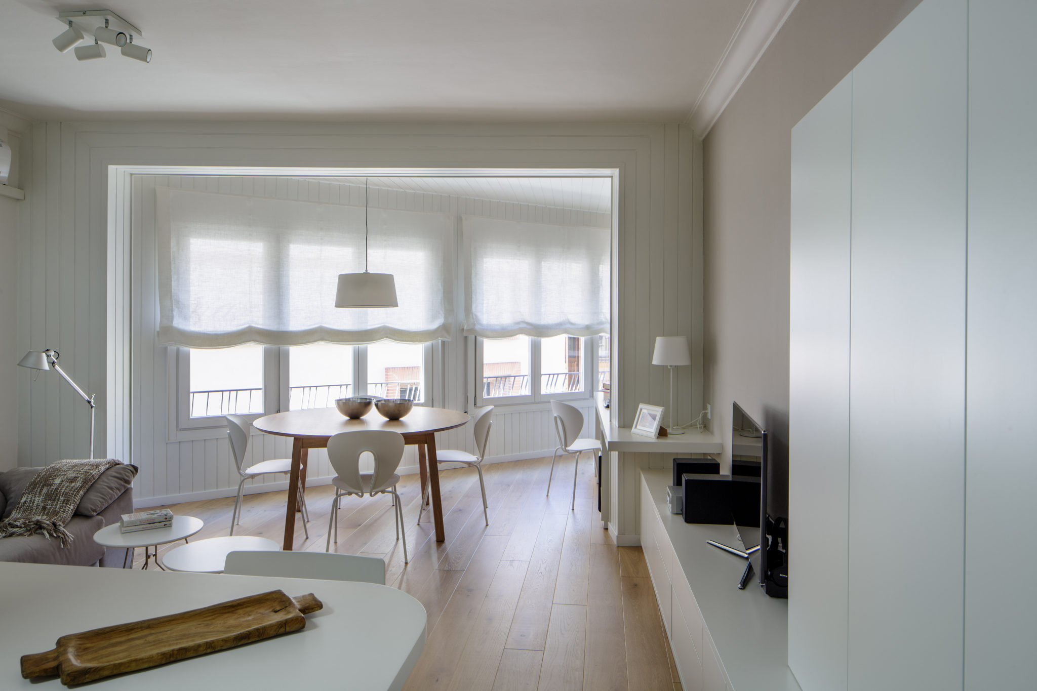 Es van emprar materials naturals, com parquet de fusta de roure natural de tonalitat clara i el mobiliari realitzat a mida i dissenyat per nosaltres, es va fer en la seva totalitat amb dm lacat blanc.