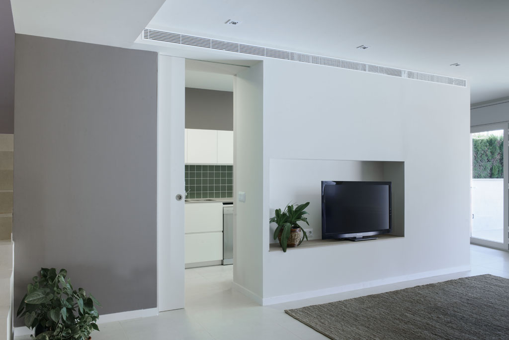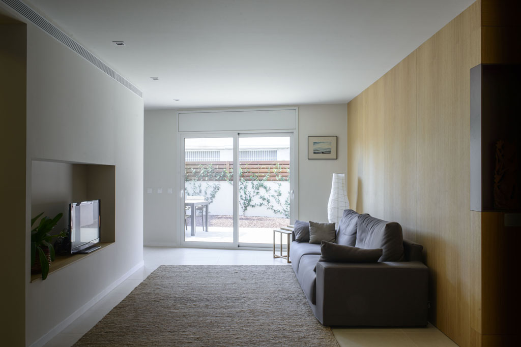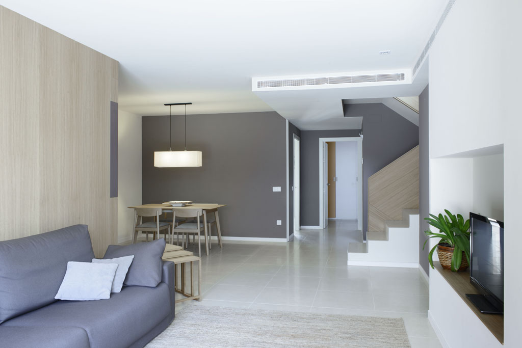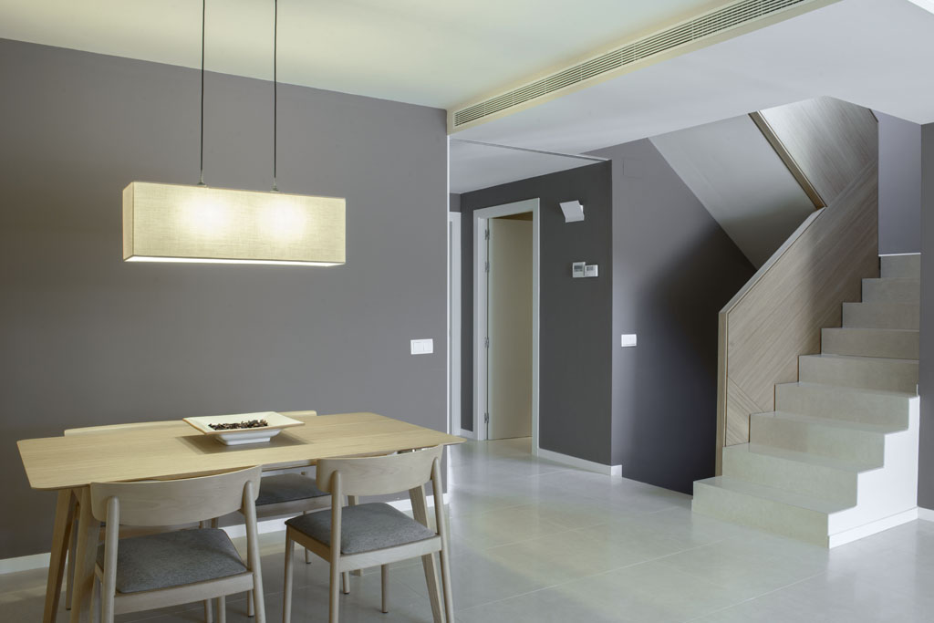 Projecte de decoració interior a partir d’un projecte d’obra nova realitzat per l’arquitecte, intervenint bàsicament en la distribució de la planta baixa destinada a zona de dia. Paviment de gres porcel·lànic de color clar per donar més lluminositat, fusteria lacada, escala interior revestida amb gres i amb una barana singular de fusta de roure, pintat general de colors de tonalitats pujades. Cuina amb mobiliari blanc, taulell de gres de color beige clar i frontal de rajola 10×10 de color verd intens. Disseny d’un moble de fusta a tota alçada com a separador entre l’entrada i la zona d’estar. Mobiliari a mida i de compra, combinant tons de fusta clara i lacats.