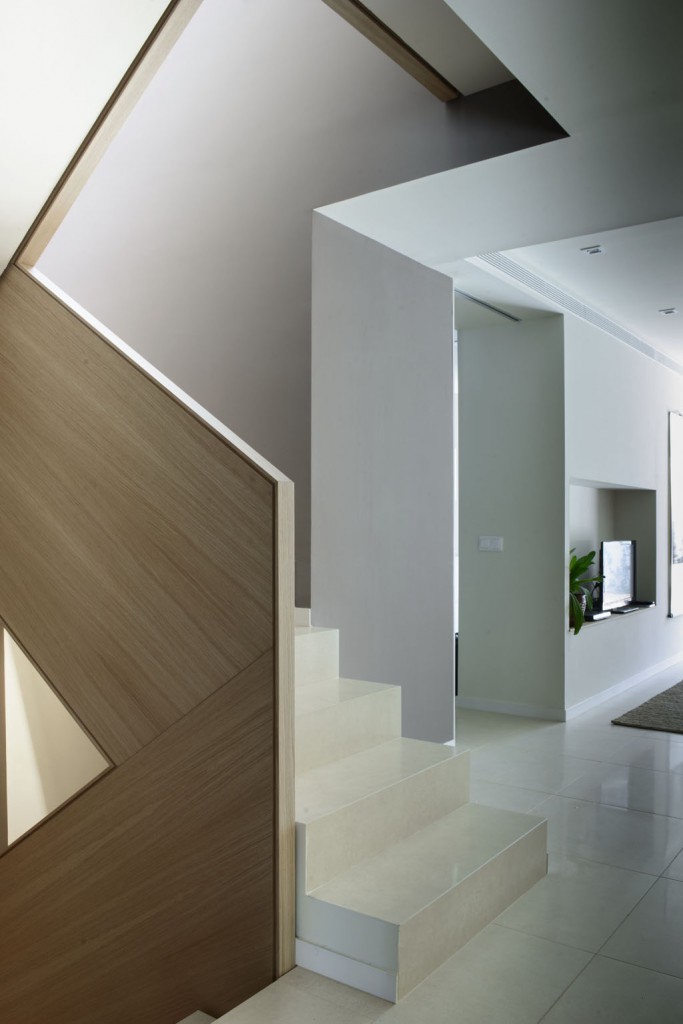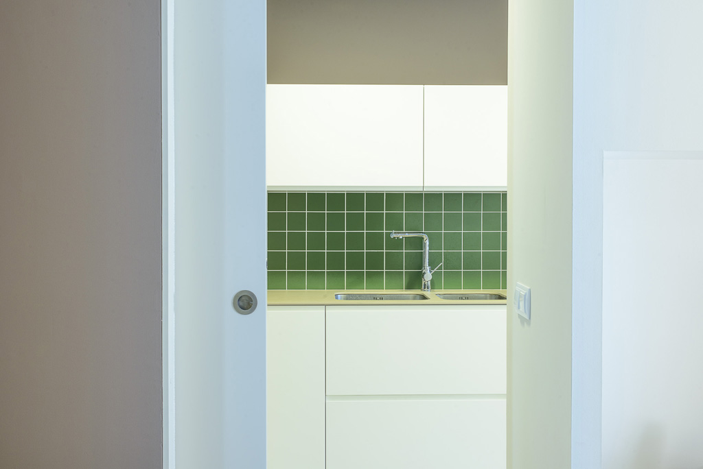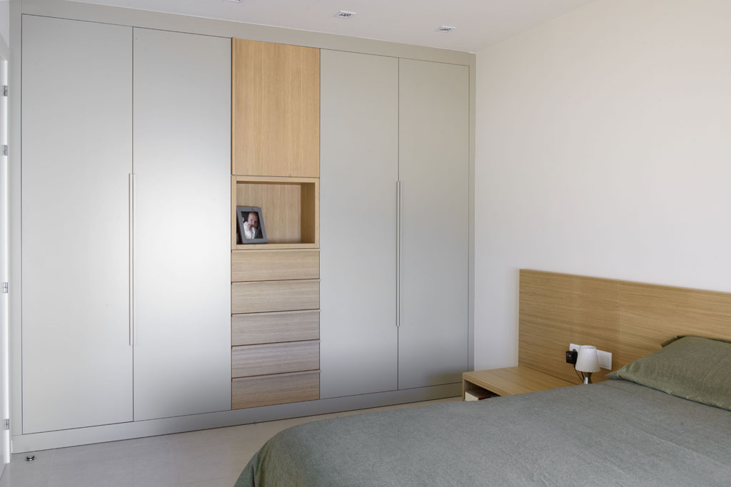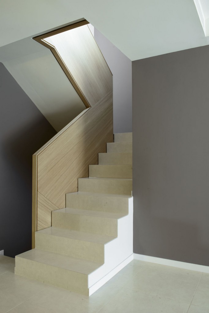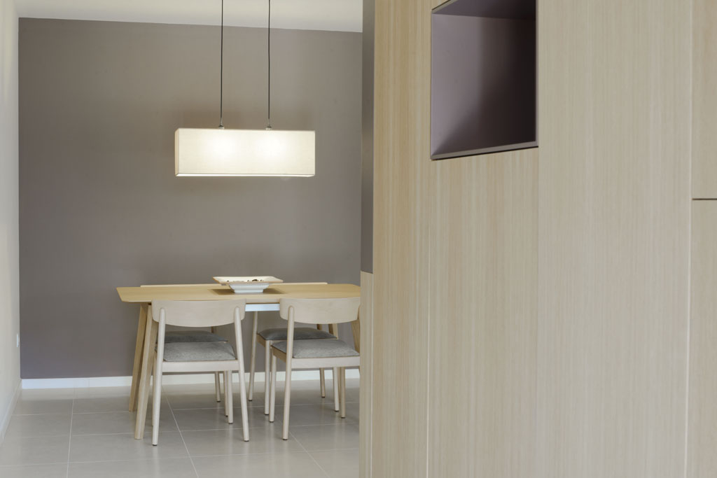 Projecte de decoració interior a partir d’un projecte d’obra nova realitzat per l’arquitecte, intervenint bàsicament en la distribució de la planta baixa destinada a zona de dia. Paviment de gres porcel·lànic de color clar per donar més lluminositat, fusteria lacada, escala interior revestida amb gres i amb una barana singular de fusta de roure, pintat general de colors de tonalitats pujades. Cuina amb mobiliari blanc, taulell de gres de color beige clar i frontal de rajola 10×10 de color verd intens. Disseny d’un moble de fusta a tota alçada com a separador entre l’entrada i la zona d’estar. Mobiliari a mida i de compra, combinant tons de fusta clara i lacats.