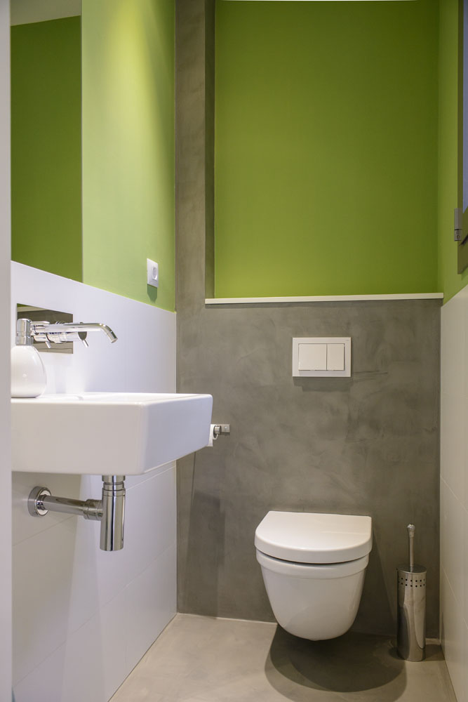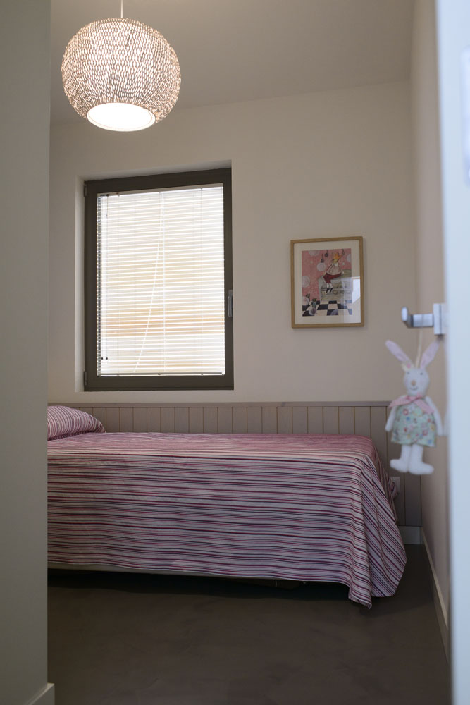 Paviment general de microciment de color acer en tot l’habitatge, combinat amb colors blancs, grisos i negres, escala interior revestida amb fusta, fusteria lacada i pintat de color en punts molt determinats. Mobiliari a mida i de compra, combinant tons de fusta clara i lacats.