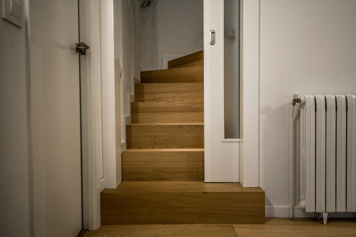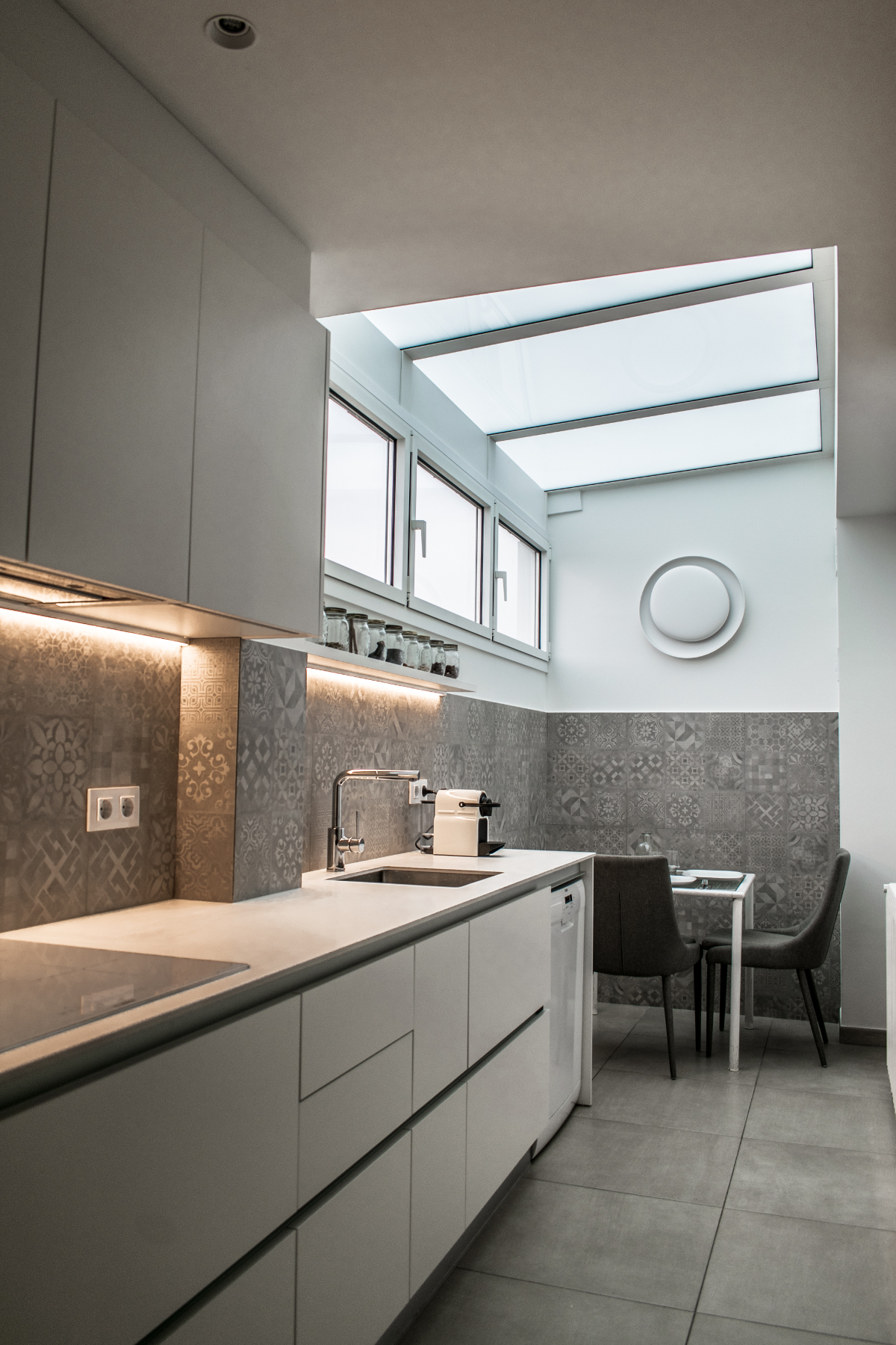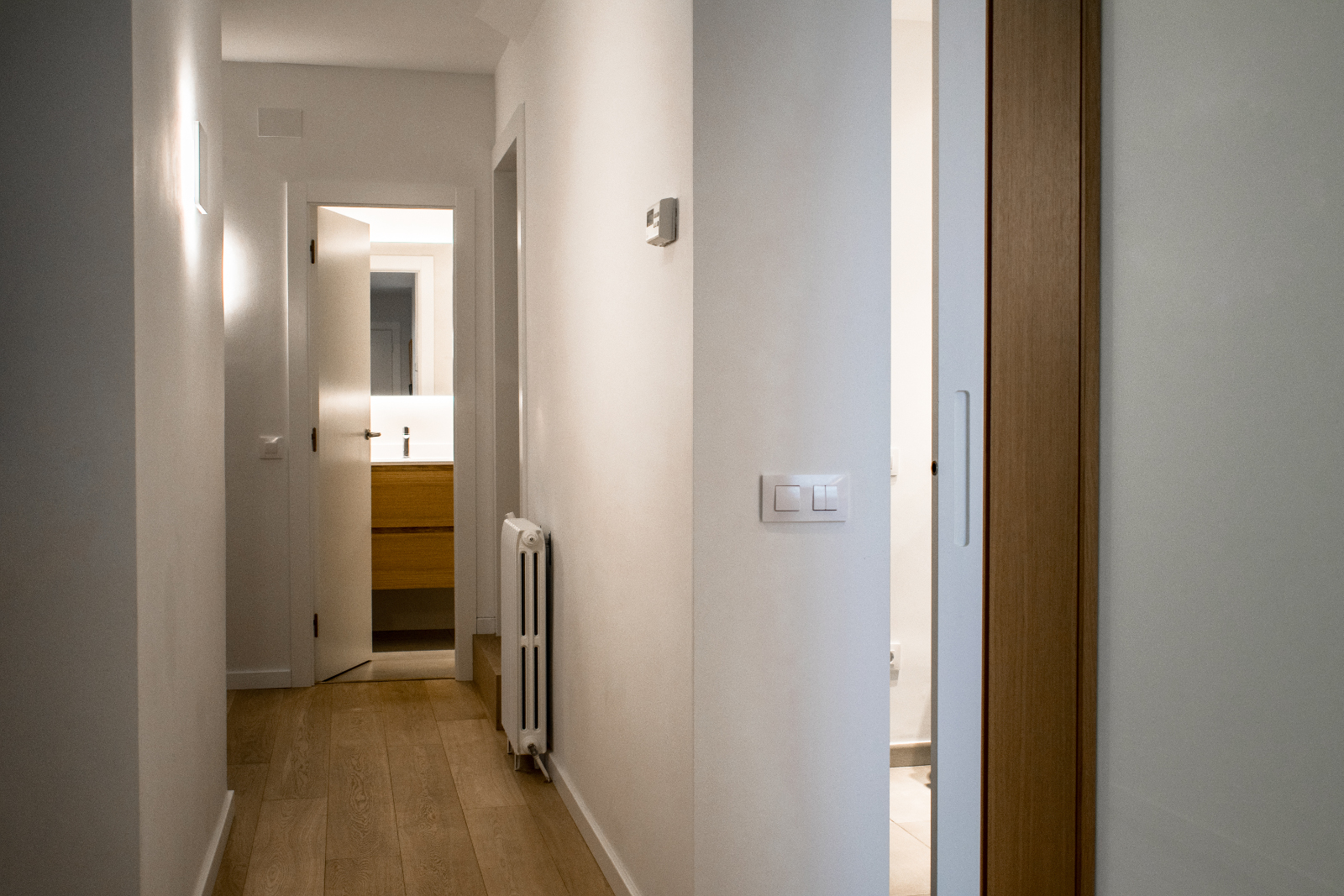 Renovació total d’una cuina de proporcions molt allargades, modificant la distribució dels usos, posant la zona de rentador cap a l’interior i posant l’office en la zona del lluernari. S’ha obert cap a l’espai d’estar-menjador amb una gran obertura on s’ha col·locat una porta corredissa de grans dimensions, a base de fusta de roure i vidre. Lacat de la fusteria i parquet natural, inclòs el folrat d’una escala, per canviar l’aire de tot l’habitatge. Reforma del bany, amb microciment blanc a les parets amb un fons de rajola decorada i efectes de llum al mirall i la dutxa.