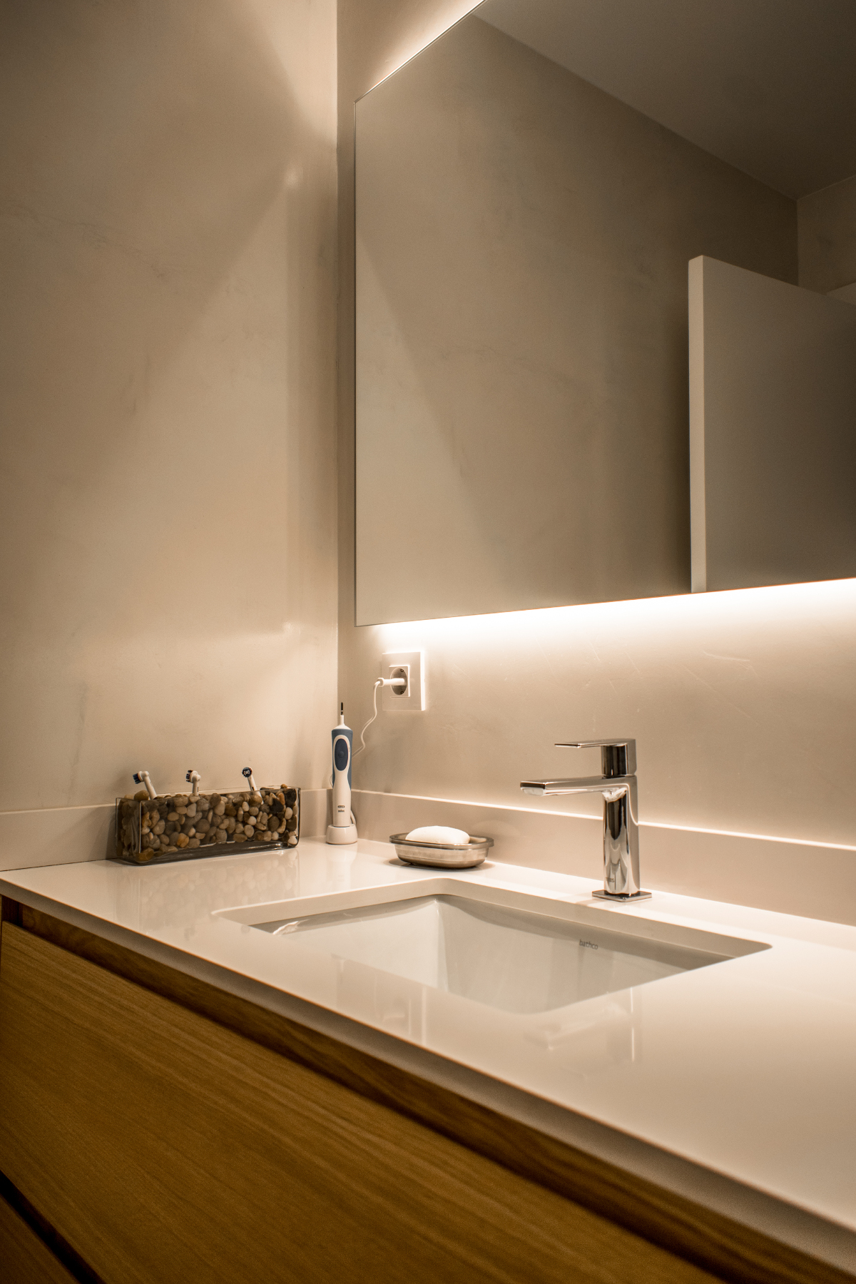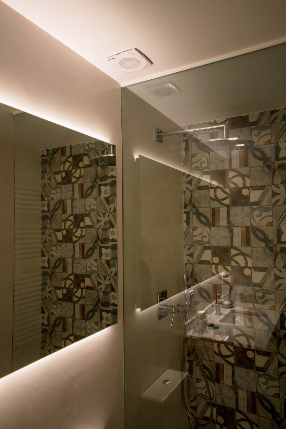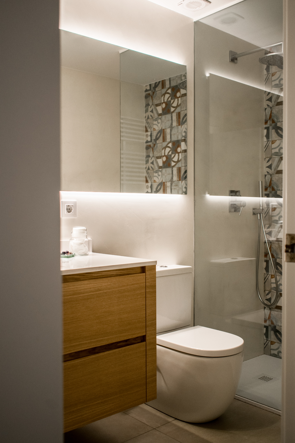 Renovació total d’una cuina de proporcions molt allargades, modificant la distribució dels usos, posant la zona de rentador cap a l’interior i posant l’office en la zona del lluernari. S’ha obert cap a l’espai d’estar-menjador amb una gran obertura on s’ha col·locat una porta corredissa de grans dimensions, a base de fusta de roure i vidre. Lacat de la fusteria i parquet natural, inclòs el folrat d’una escala, per canviar l’aire de tot l’habitatge. Reforma del bany, amb microciment blanc a les parets amb un fons de rajola decorada i efectes de llum al mirall i la dutxa.