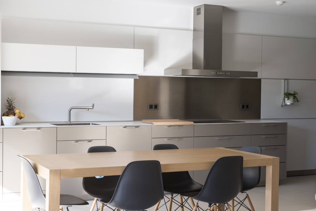 El blanc és el color que domina en les parets de l’habitatge, amb només aplicacions puntuals de color: revestiments de rajola en algun bany, elements singulars com la llar de foc, etc. En la zona dels pares, tota la fusteria està feta a mida amb fusta de roure precompost. En la dels nens s’ha optat pel DM de color. Cuina combinant colors blanc, gris i superfícies d’acer inoxidable. I tot complementat amb lluminàries i peces de mobiliari de molta presència i qualitat.