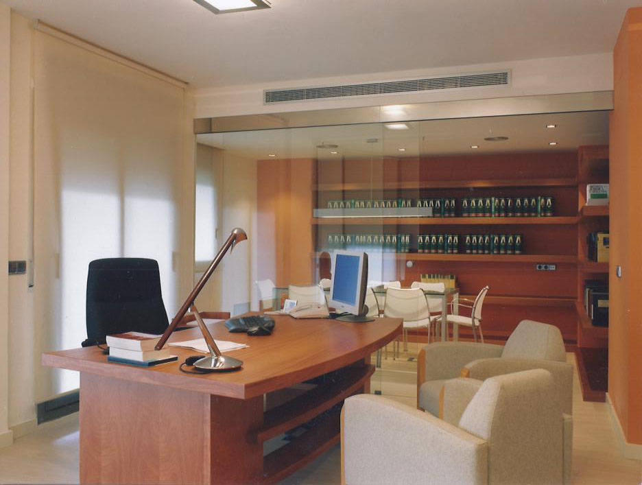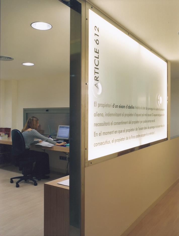 Paviment a base de parquet clar, fusteria general de cedre, incloses les peces de mobiliari fetes a mida, i parets i sostres pintats de color clar. Per donar més claror a les zones interiors i com a detall singular, en algunes parets es van introduir superfícies de vidre translúcid emmarcats amb acer inoxidable i amb textos legals impresos amb vinil. Tancament amb vidre transparent del despatx principal respecte la sala de juntes i tractament del pati interior amb terra amb lames de fusta i parets pintades de colors terrosos, amb introducció de plantes decoratives i llum puntual.