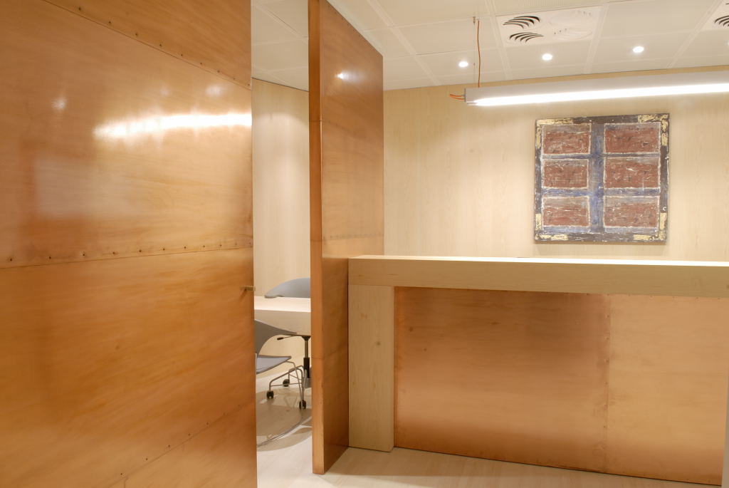 En la zona de recepció del client es va treballar amb fusta d’auró tenyida clara, combinada amb planxa de coure vernissada: es va dissenyar el taulell i un parament amb portes corredisses per crear un lloc d’atenció una mica més reservat. Com a paviment general es va posar un parquet de color clar i el sostre, que havia de ser registrable, es va fer amb plaques de color blanc. Les divisions es van fer amb mampares revestides amb fusta d’auró darrera el taulell de recepció i en un lateral i de pladur pintades com el color del sostre a l’altra banda, per delimitar els despatxos d’atenció personalitzada. A la zona del passadís es van introduir parts del tancament a base de DM lacat de color ataronjat amb vidres traslúcids. En la resta d’espais es van utilitzar colors clars i portes corredisses de vidre, per intentar fer arribar la claror perimetral a la zona central de les oficines.