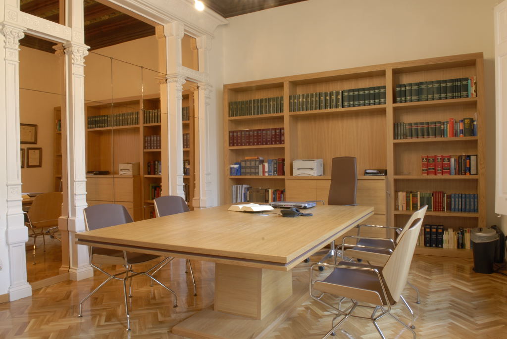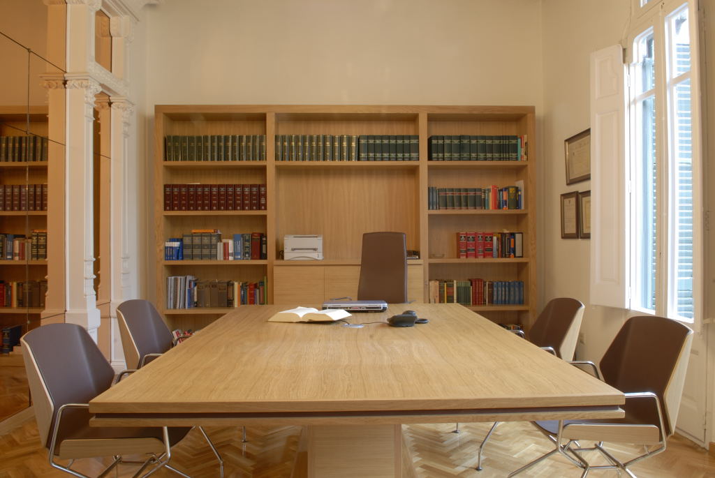 A l’interior dels despatxos es va treballar bàsicament a nivell de mobiliari a mida, pintura i il·luminació. El mobiliari fet a mida es va fer, majoritàriament, amb DM lacat del mateix to clar que es van pintar les parets i que així quedés perfectament integrat. El mobiliari de la sala de juntes es va fer de fusta de roure, a joc amb el mobiliari que s’hi va col·locar.