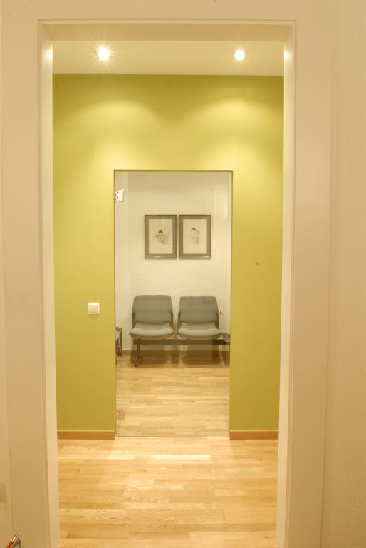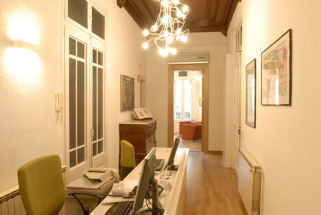 A la zona de recepció es va dissenyar tot el mobiliari a mida, amb DM lacat de color blanc, es va posar un terra de parquet d’un color que respectés la tonalitat de l’existent a la resta de dependàncies i es van col·locar lluminàries noves i mobiliari auxiliar.