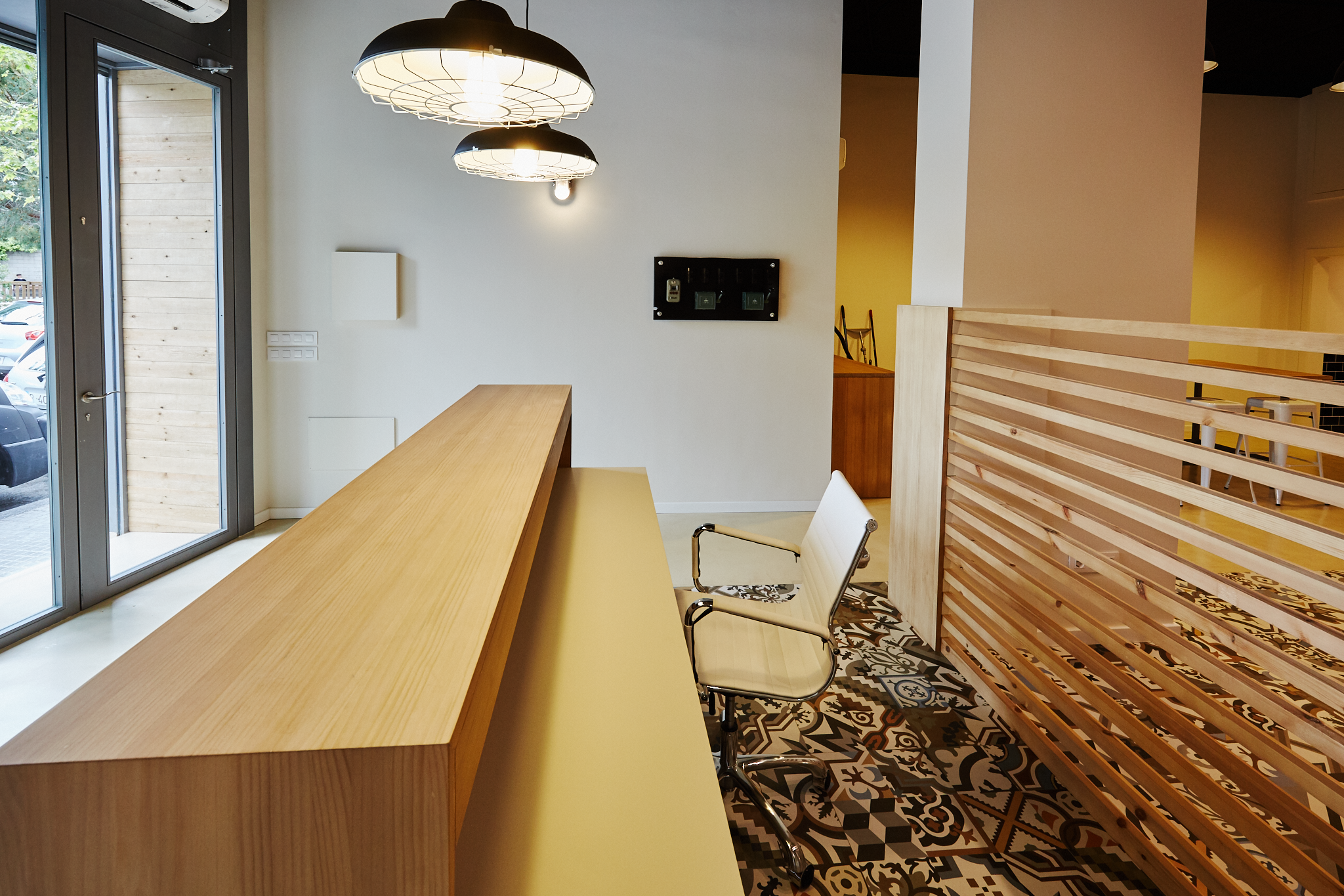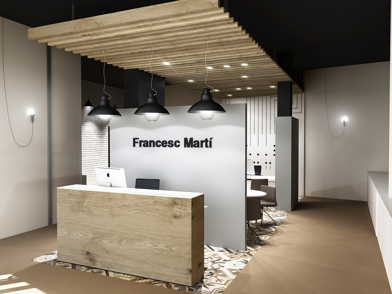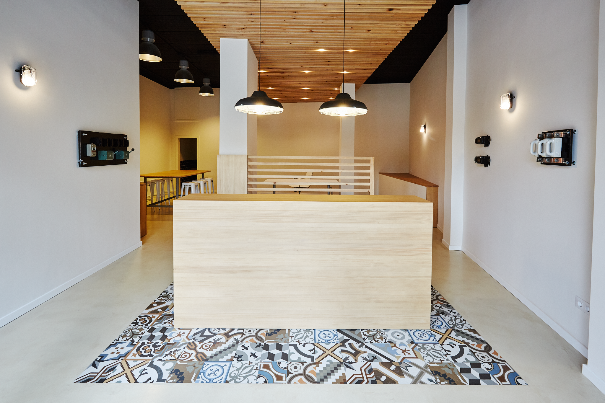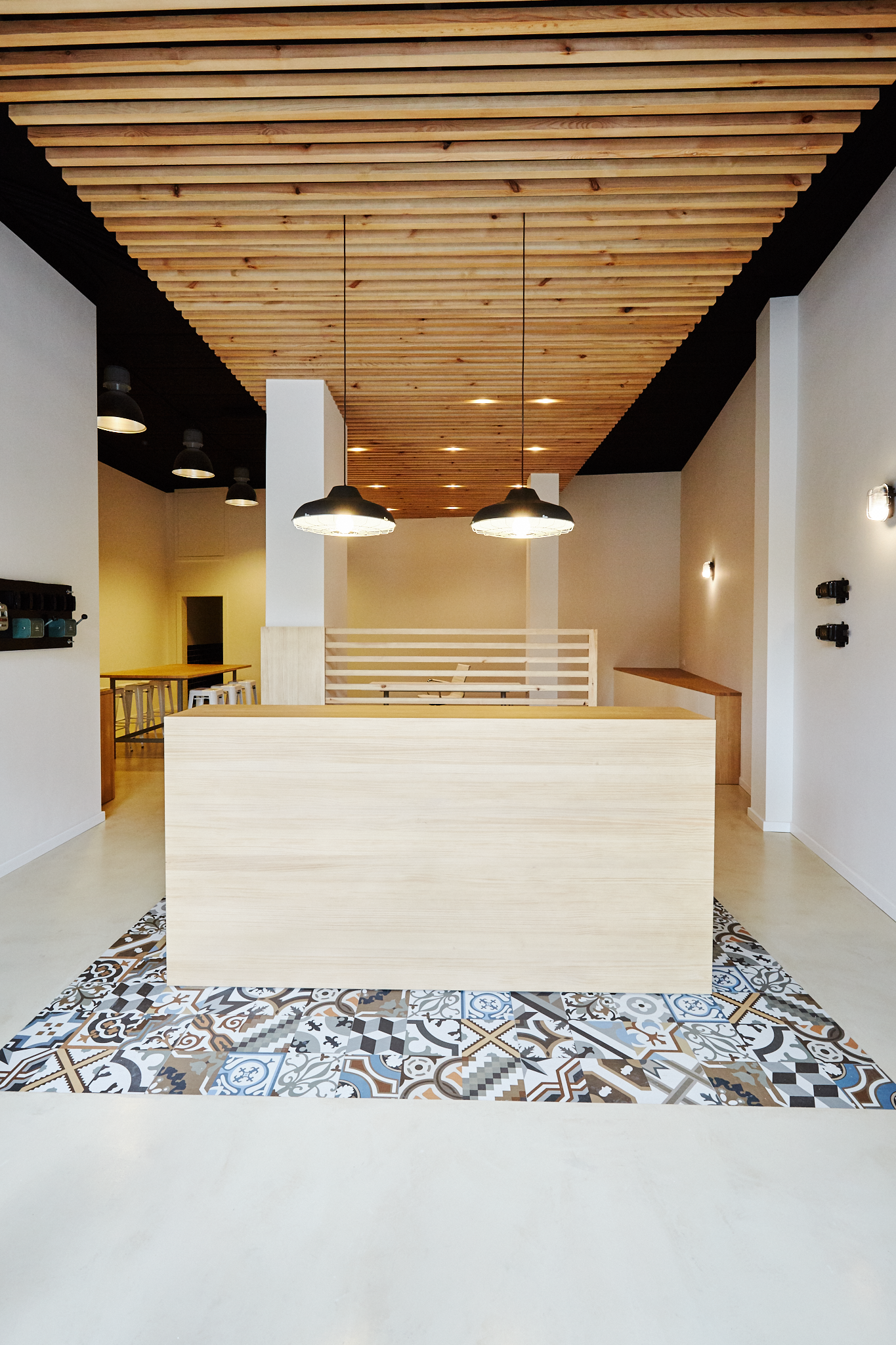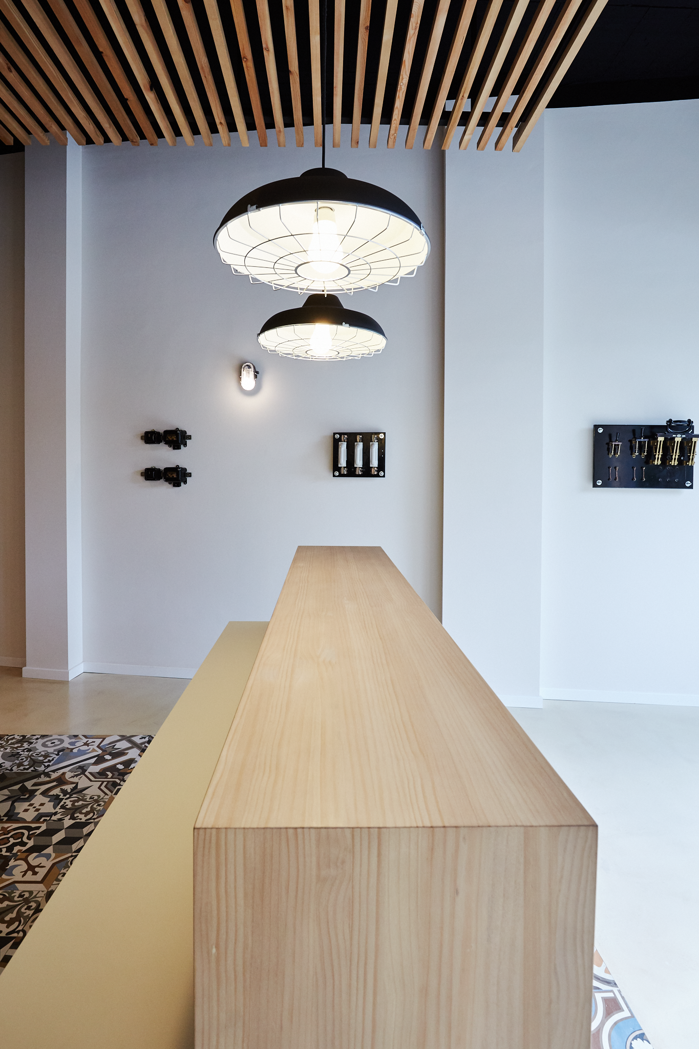 Adequació d’un local com a oficina d’ús privat per una empresa de lampisteria. S’ha eliminat la solució estándar de sostre que hi havia originalment al local i s’ha substituit per un sostre de llistons de fusta. La projecció en planta d’aquest sostre correspon a una catifa de rajola decorada al terra amb la resta de paviment a base de microciment. La solució final de les peces divisòries i decoratives ha estat diferent a les inicialment previstes, tal com es pot veure amb la vista 3D que s’inclou en les imatges.