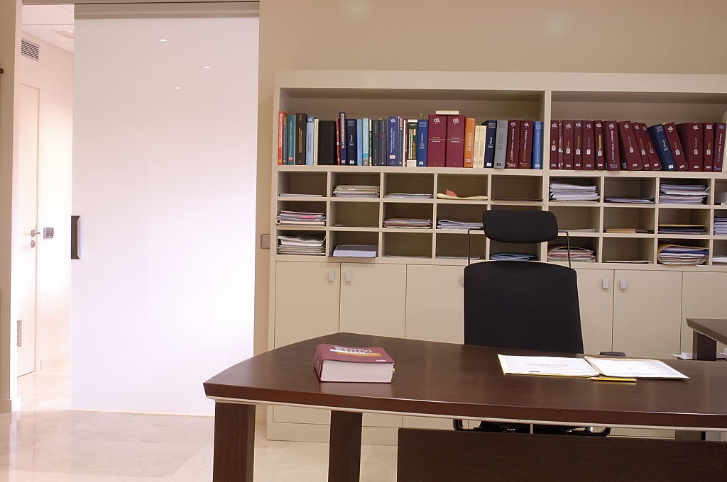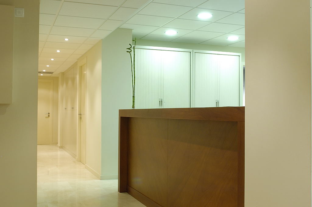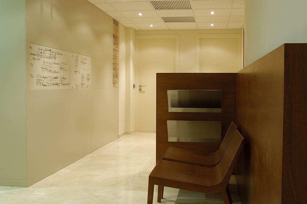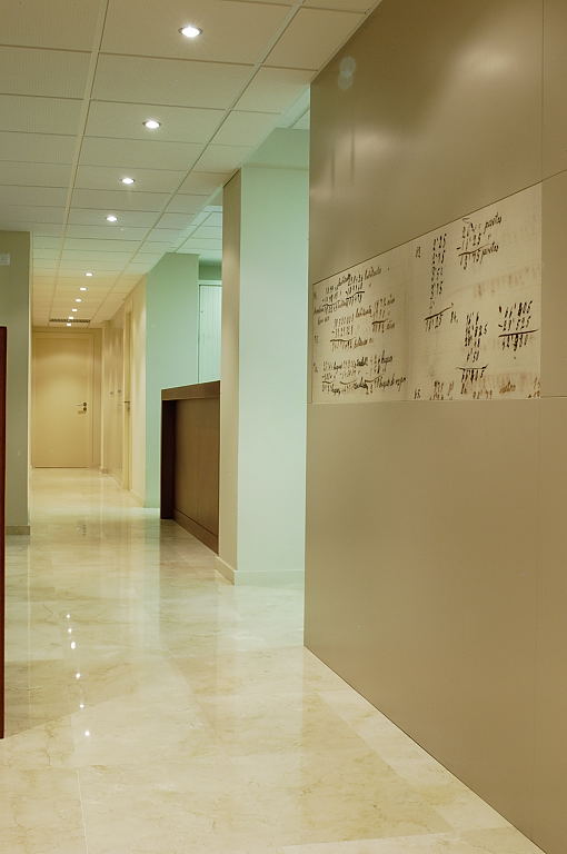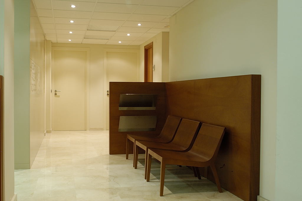 A partir del paviment existent de color clar, tota la fusteria es va pintar d’una tonalitat similar, excepte les peces de mobiliari singular. El taulell de recepció i un parament per delimitar la sala d’espera, es van fer amb fusta de cedre, amb cadires de fusta amb la mateixa tonalitat. En un parament de DM pintat s’hi van integrar fotografies de documents antics aportats pel mateix client.