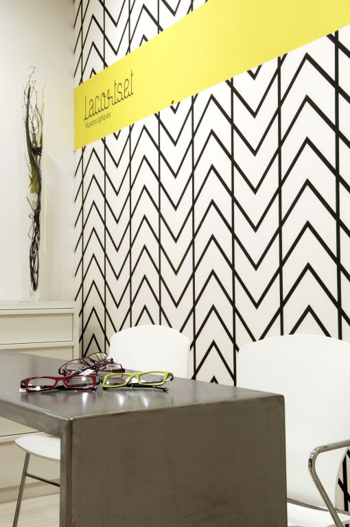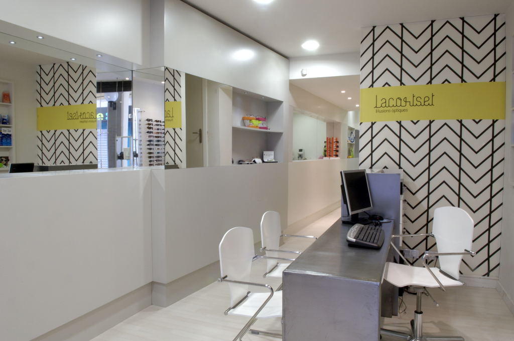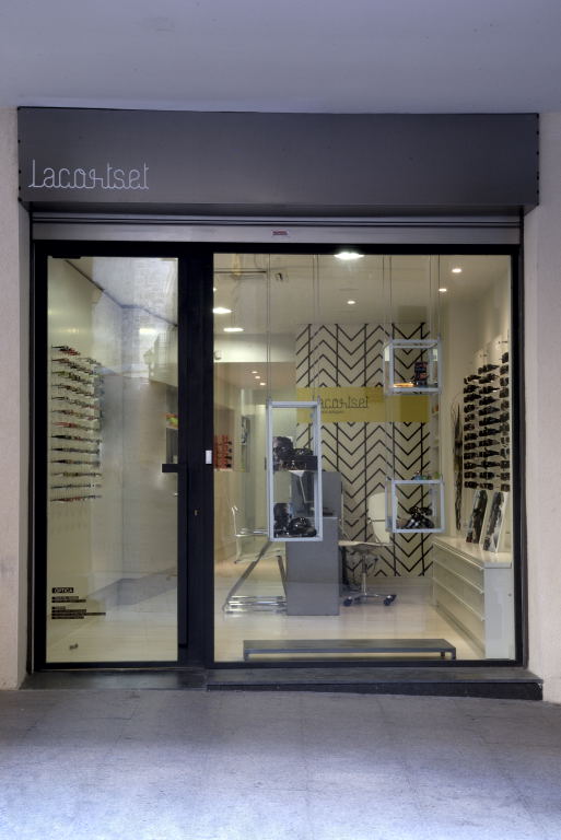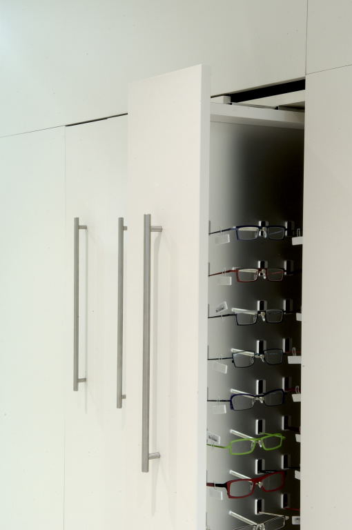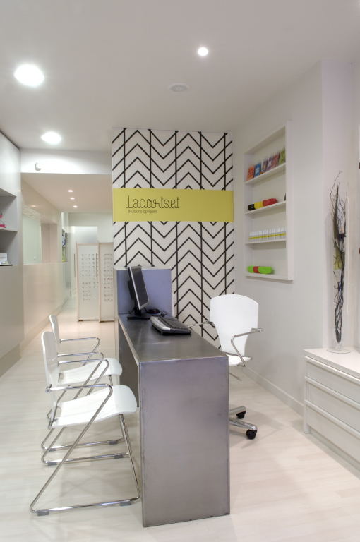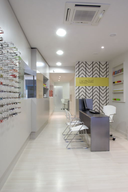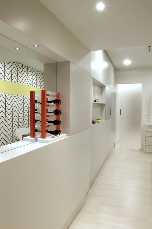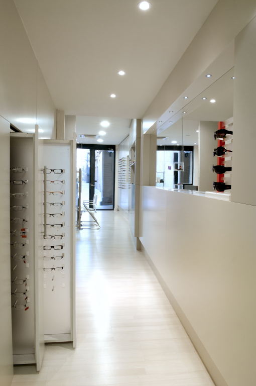 A la banda on les parets del local presentaven més irregularitats, es van projectar tota una successió de plans, amb distintes inclinacions cadascun, tractats amb DM lacat de diferents tonalitats de colors pedra molt clars i miralls, per fer d’expositors oberts d’ulleres .