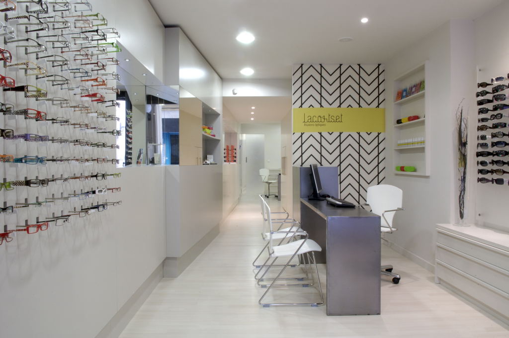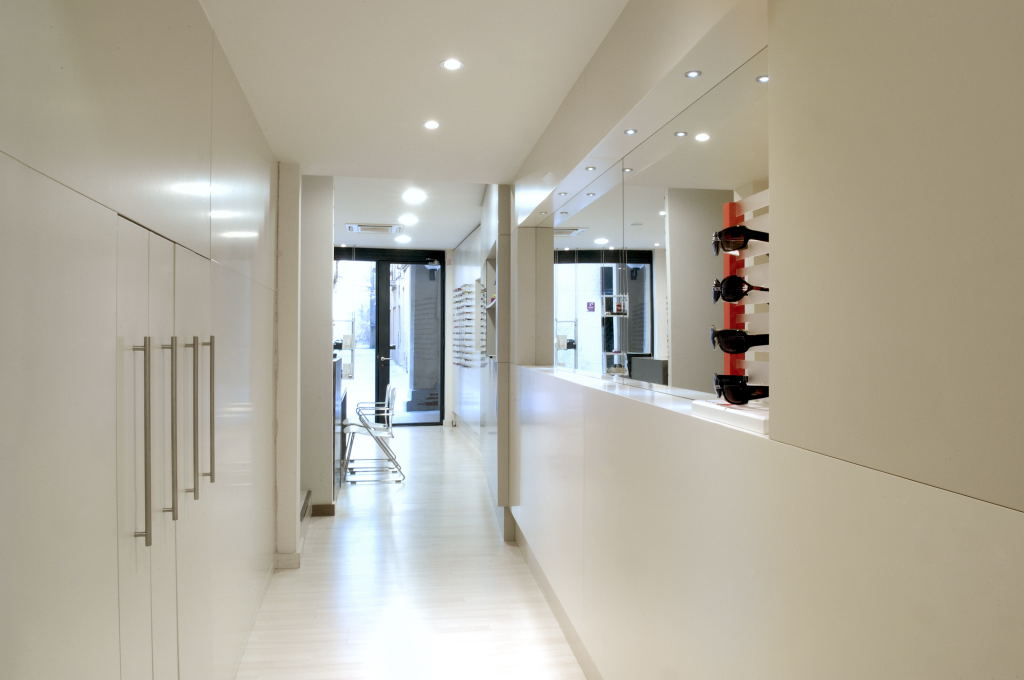 La forma del local, molt estret i allargat, va condicionar tant la distribució en planta de la nova òptica com l’aplicació de determinats materials per donar més sensació d’amplitud.