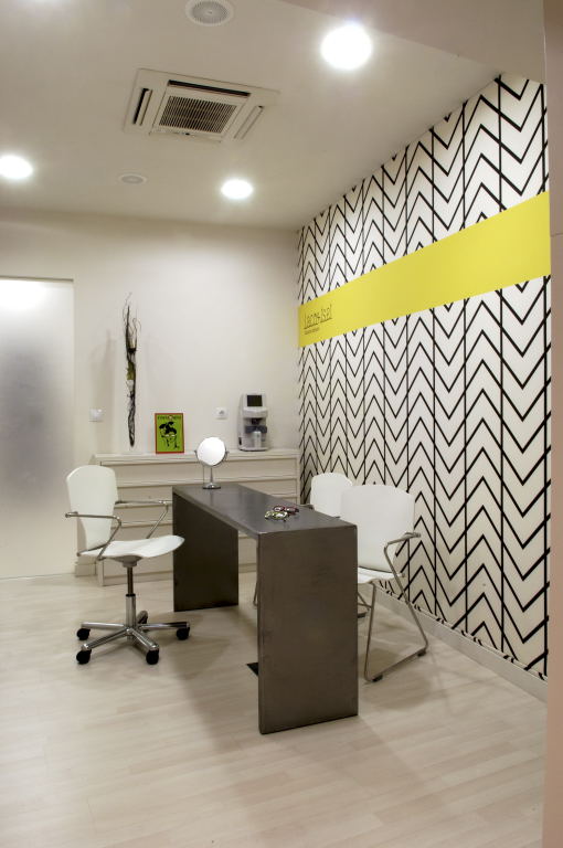 El sostre de color blanc i una aplicació gràfica “d’il·lusions òptiques” van acabar de configurar el conjunt, juntament amb una entrada senzilla, molt transparent, amb perfileria de ferro pintat.