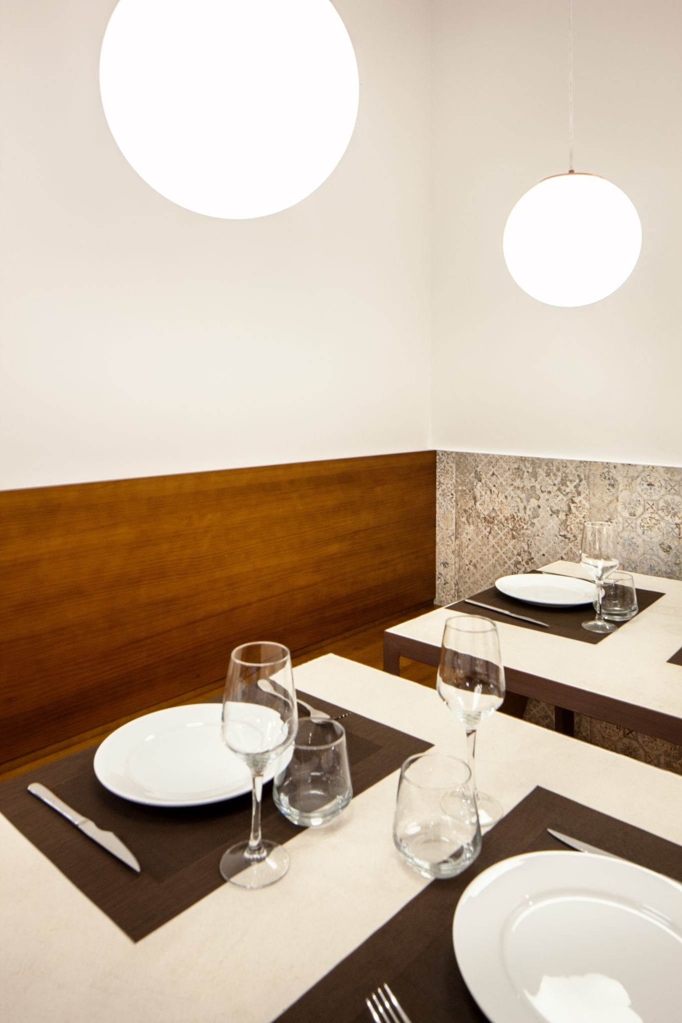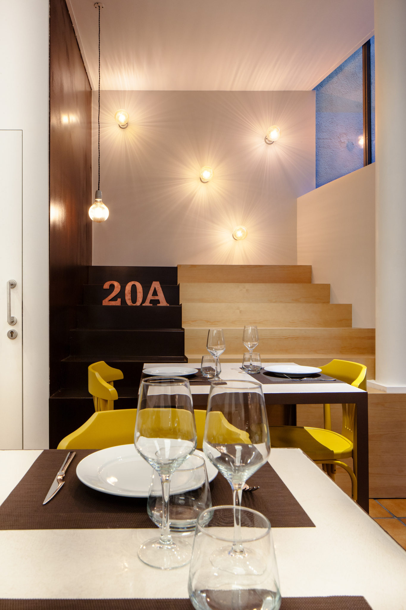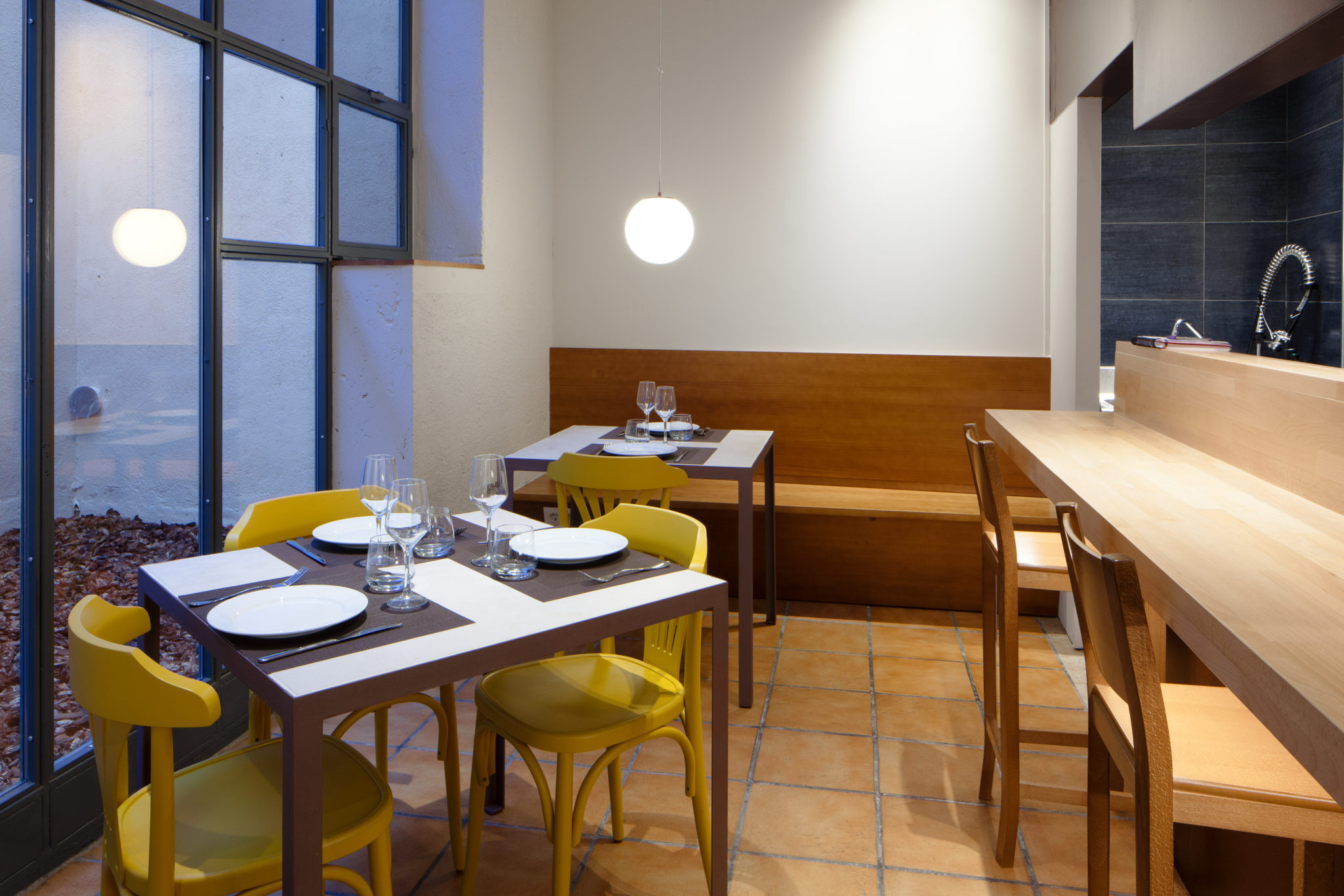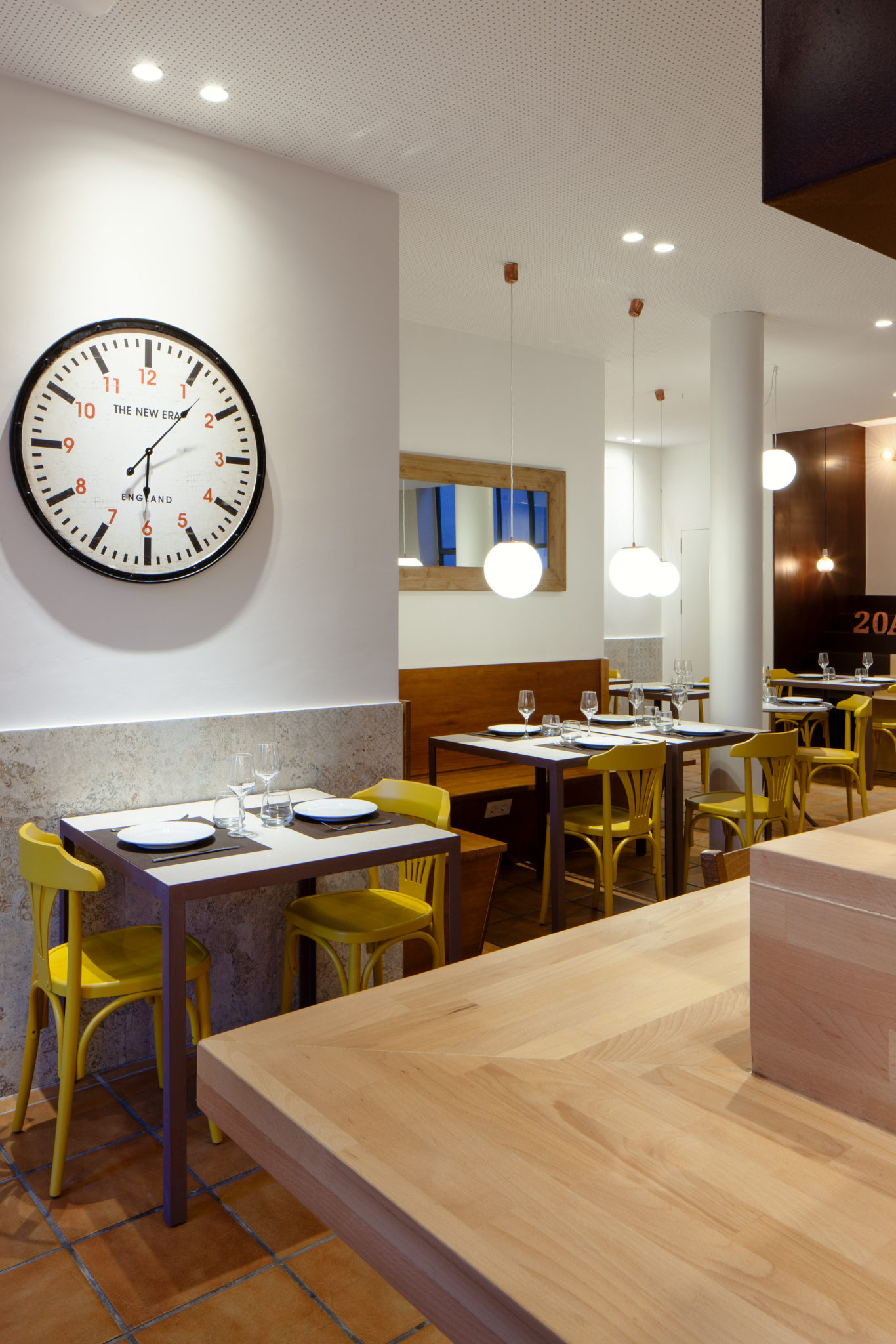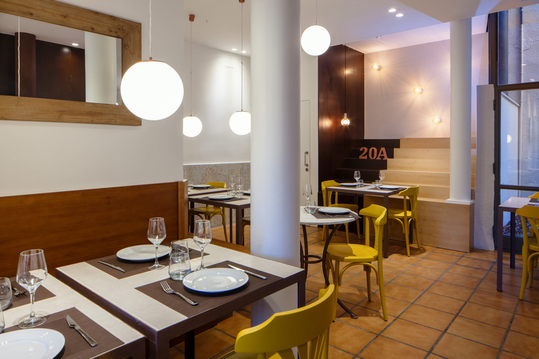Domini del color blanc a les parets, combinació de lluminàries empotrades al sostre i penjades, taules fetes a mida, a base de ferro i sobre de cerámica, i cadires color mostassa acaben de completar la composició del conjunt.