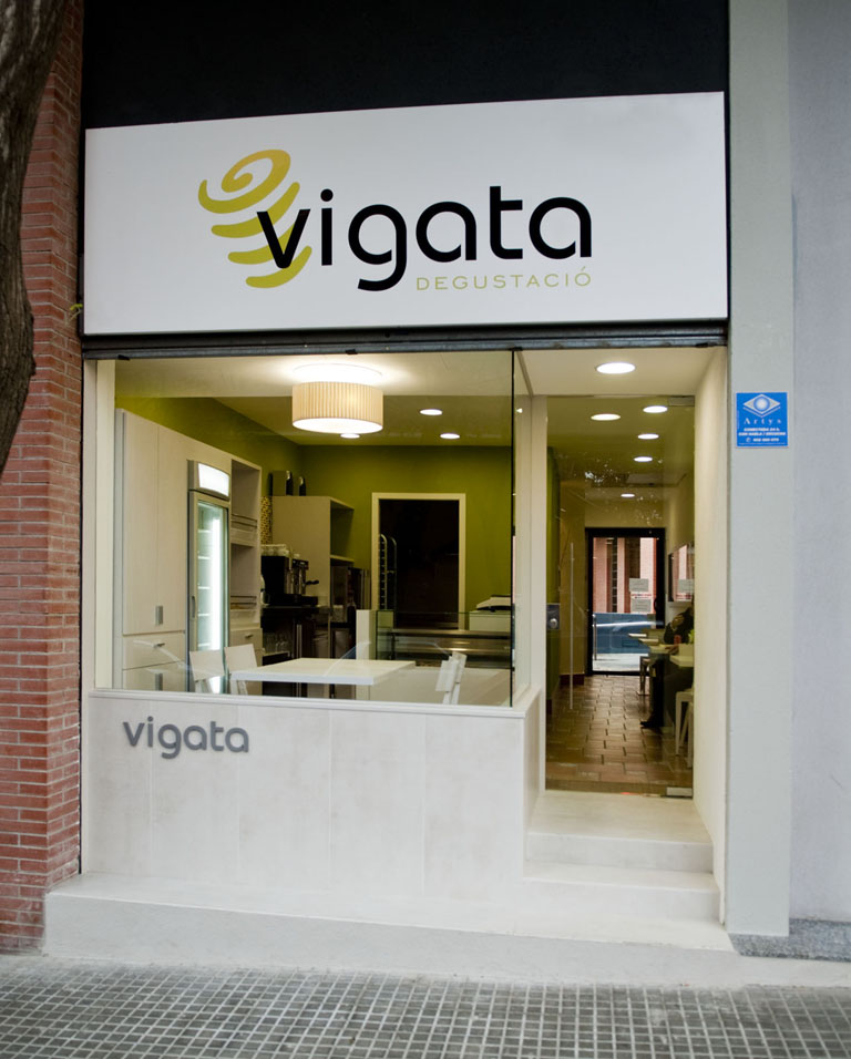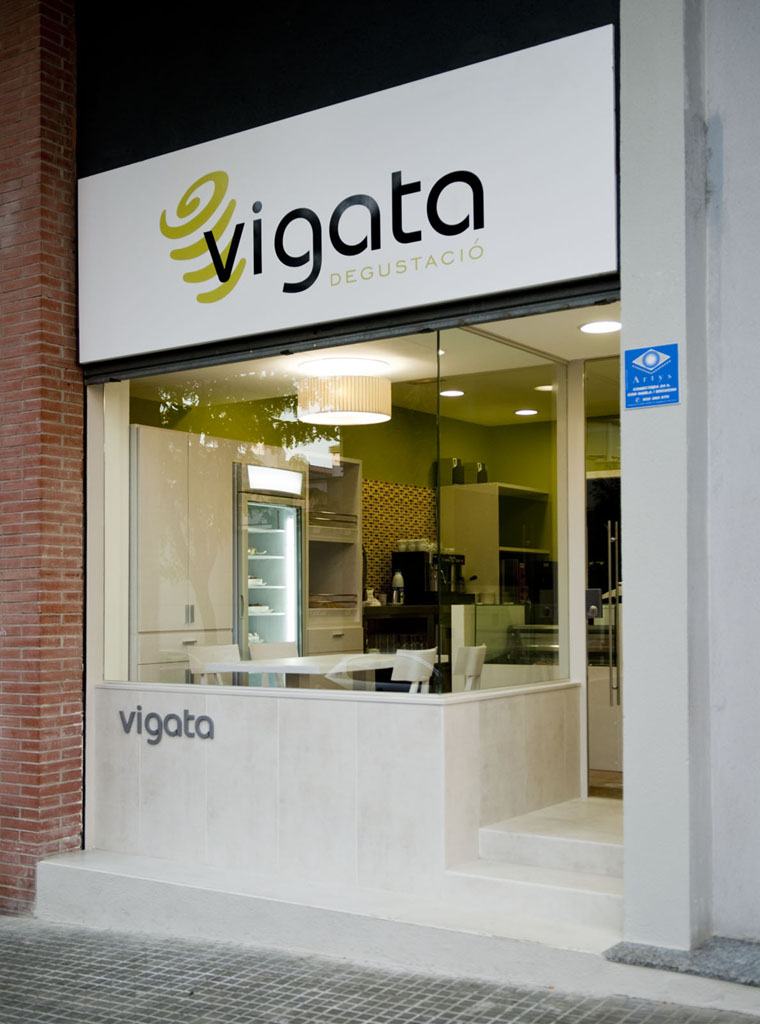 Es va col·locar un mirall emmarcat amb fusta en tota la longitud del local, per duplicar-ne la imatge. Es va dissenyar una façana molt neta i transparent, fent un revestiment de pedra molt clara tant de les parets com dels escalons d’accés.